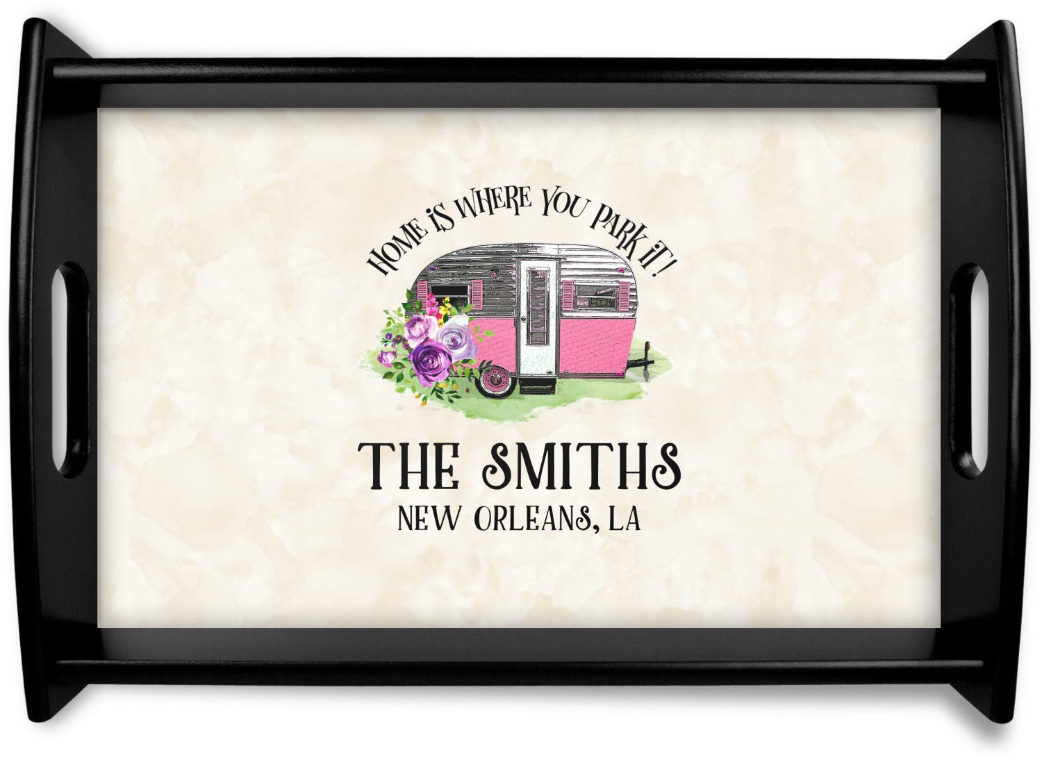 This fun design is absolutely stunning. The background is a subtle tan watercolor texture. The main graphic is an adorable pink trailer camper with sweet flowers all around it. The phrase going above it says "Home is where you park it!" You can easily personalize the text to say the place and date of a specific camping trip you always want to remember.