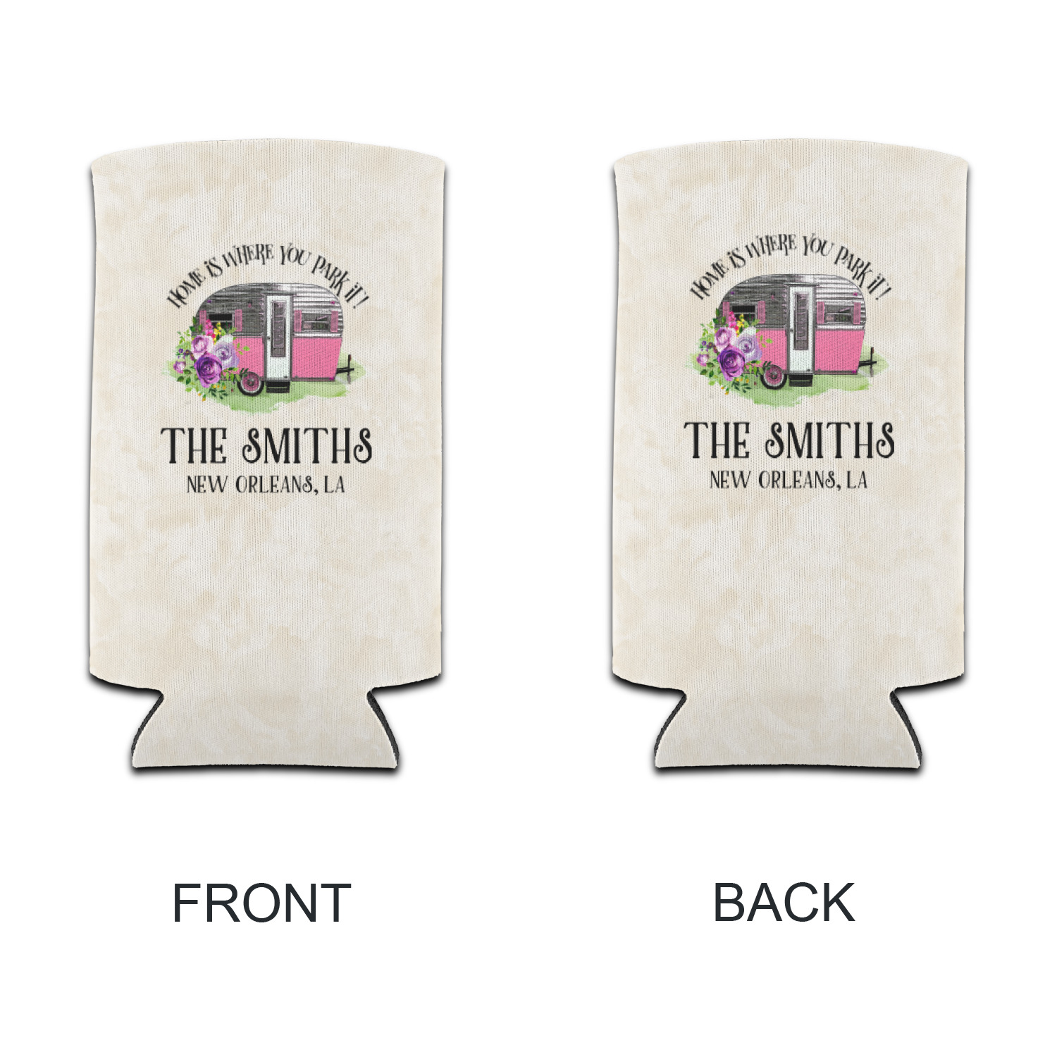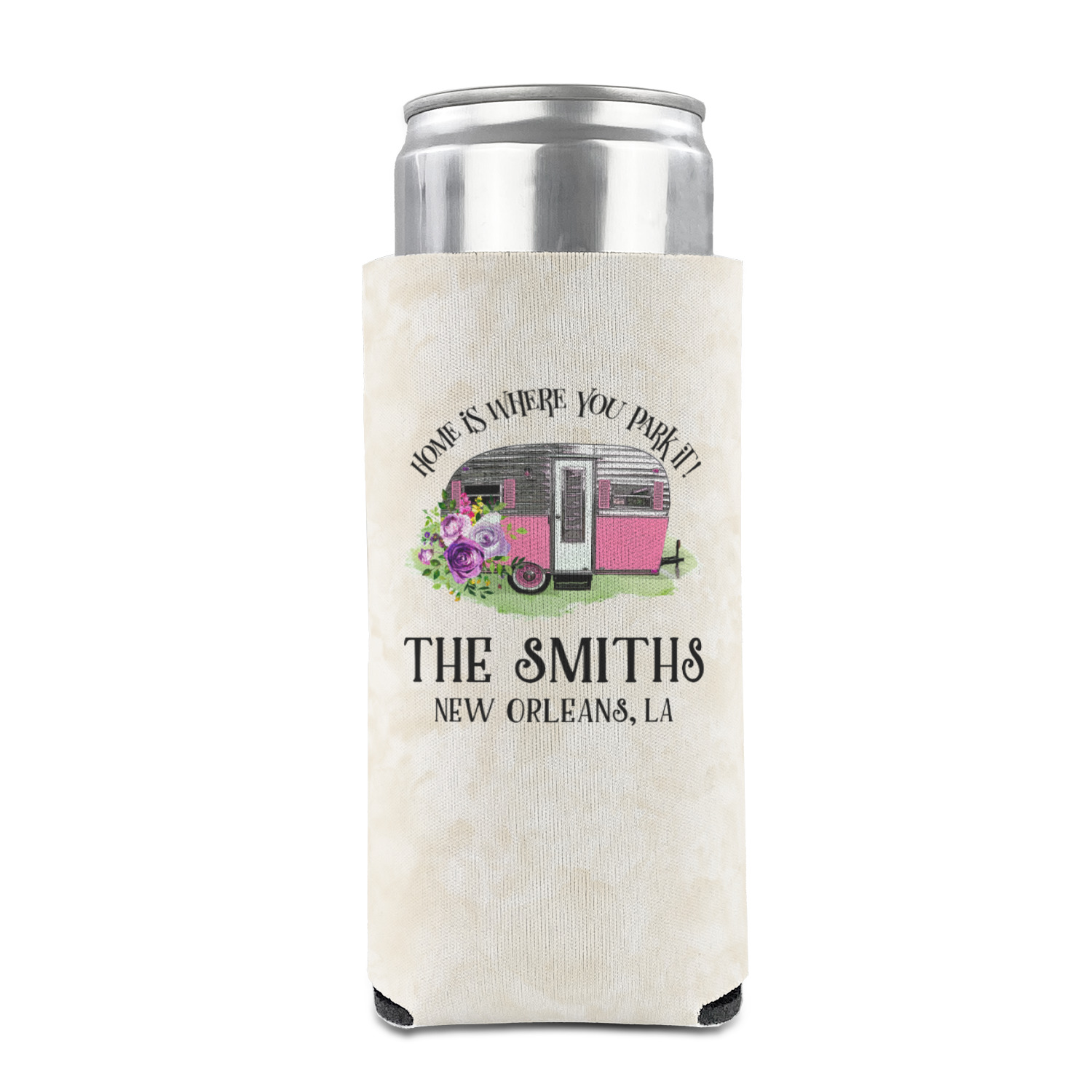 This fun design is absolutely stunning. The background is a subtle tan watercolor texture. The main graphic is an adorable pink trailer camper with sweet flowers all around it. The phrase going above it says "Home is where you park it!" You can easily personalize the text to say the place and date of a specific camping trip you always want to remember.