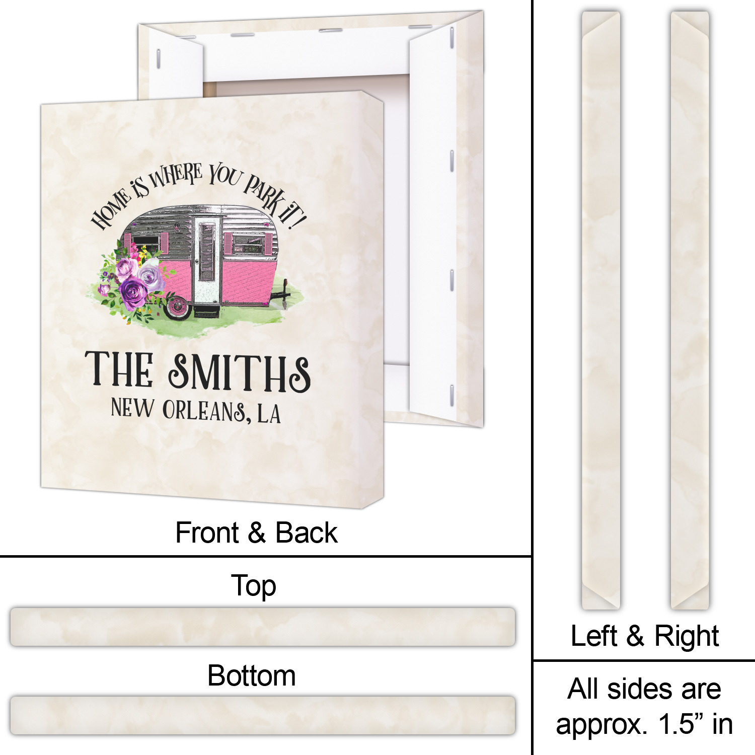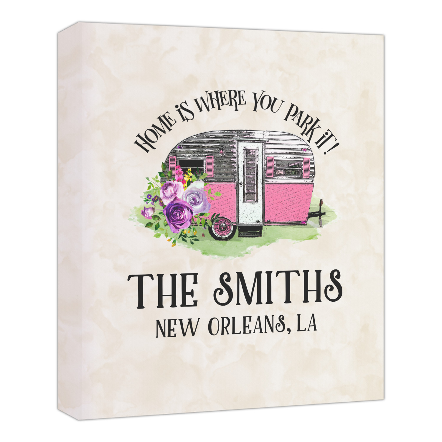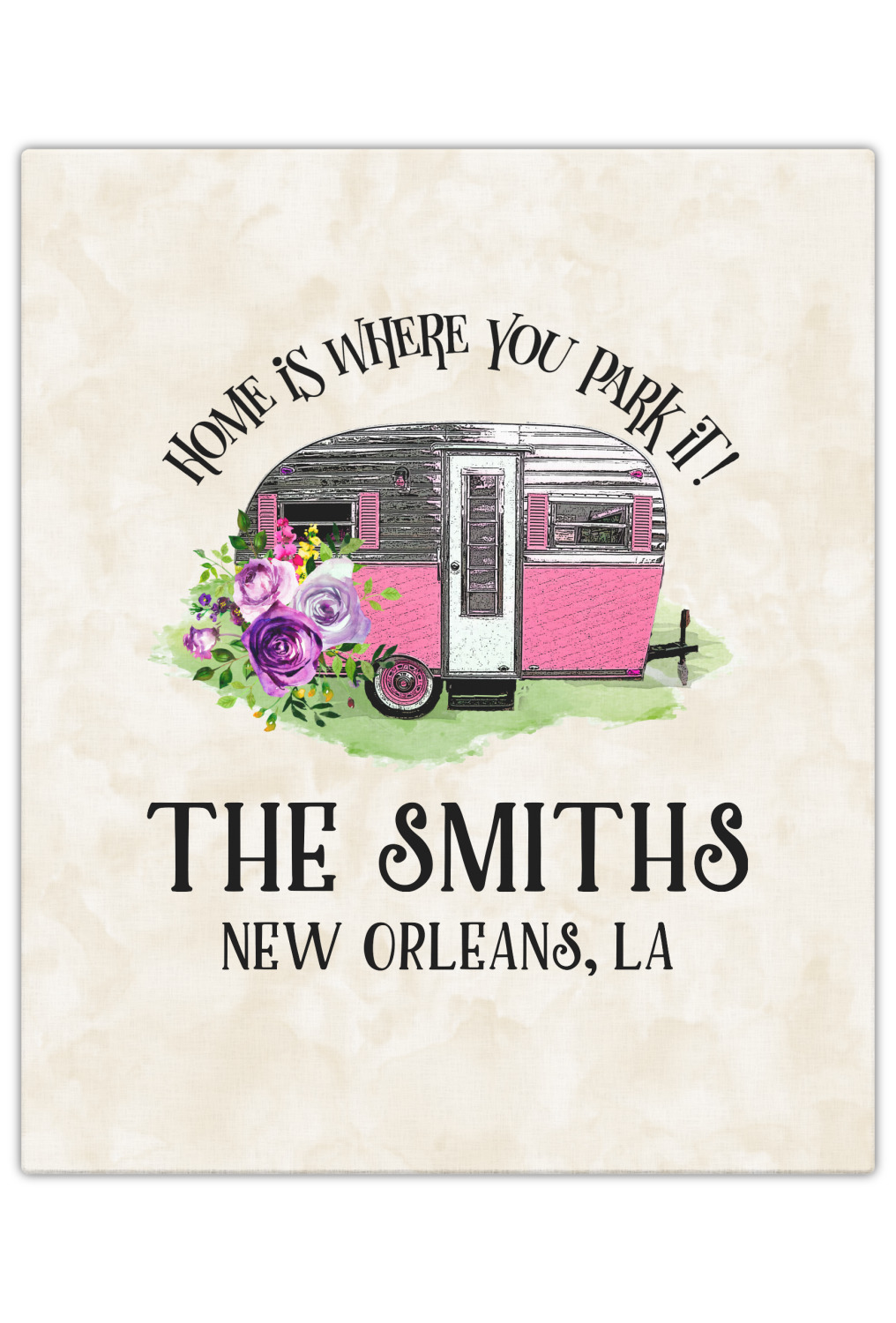 This fun design is absolutely stunning. The background is a subtle tan watercolor texture. The main graphic is an adorable pink trailer camper with sweet flowers all around it. The phrase going above it says "Home is where you park it!" You can easily personalize the text to say the place and date of a specific camping trip you always want to remember.