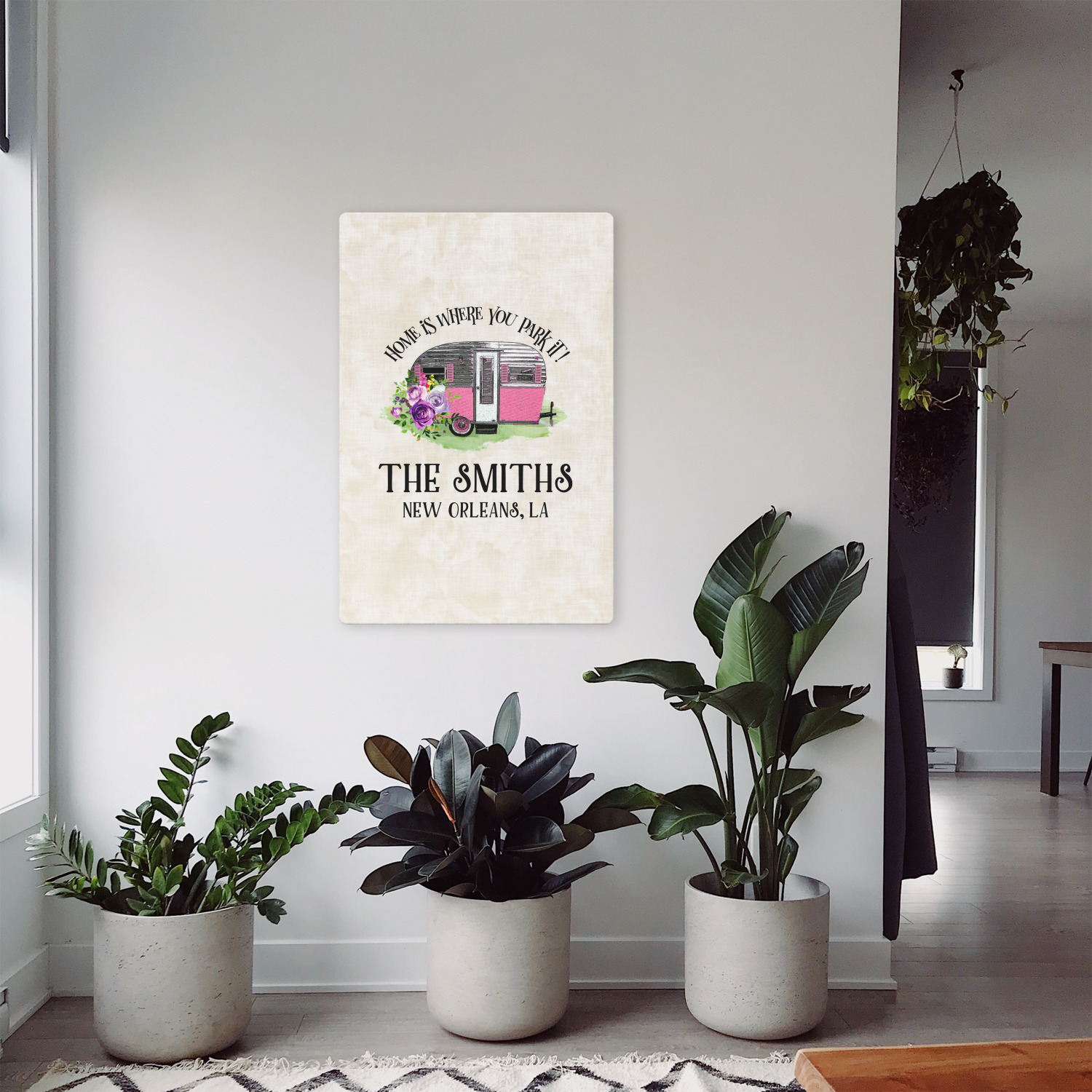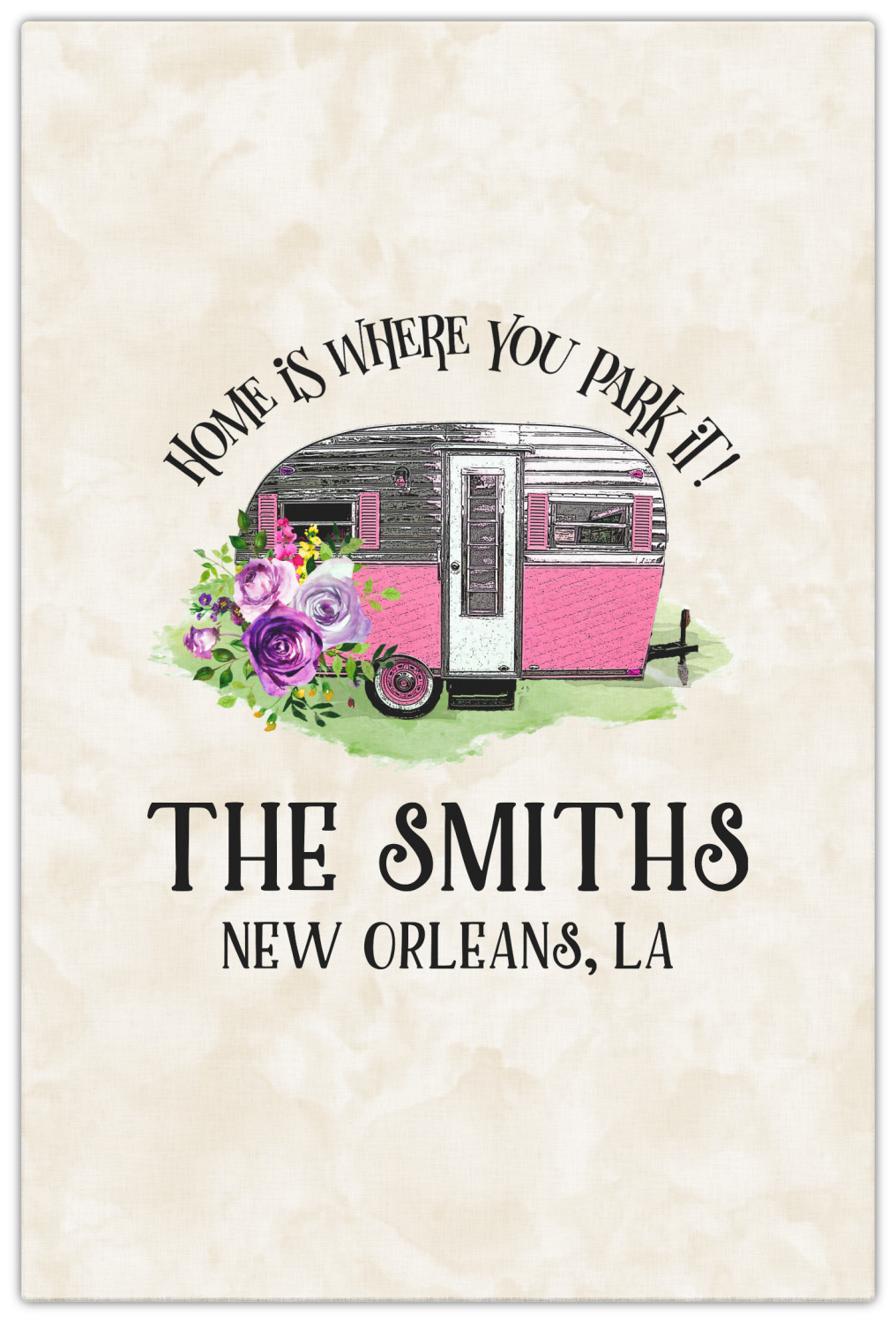 This fun design is absolutely stunning. The background is a subtle tan watercolor texture. The main graphic is an adorable pink trailer camper with sweet flowers all around it. The phrase going above it says "Home is where you park it!" You can easily personalize the text to say the place and date of a specific camping trip you always want to remember.