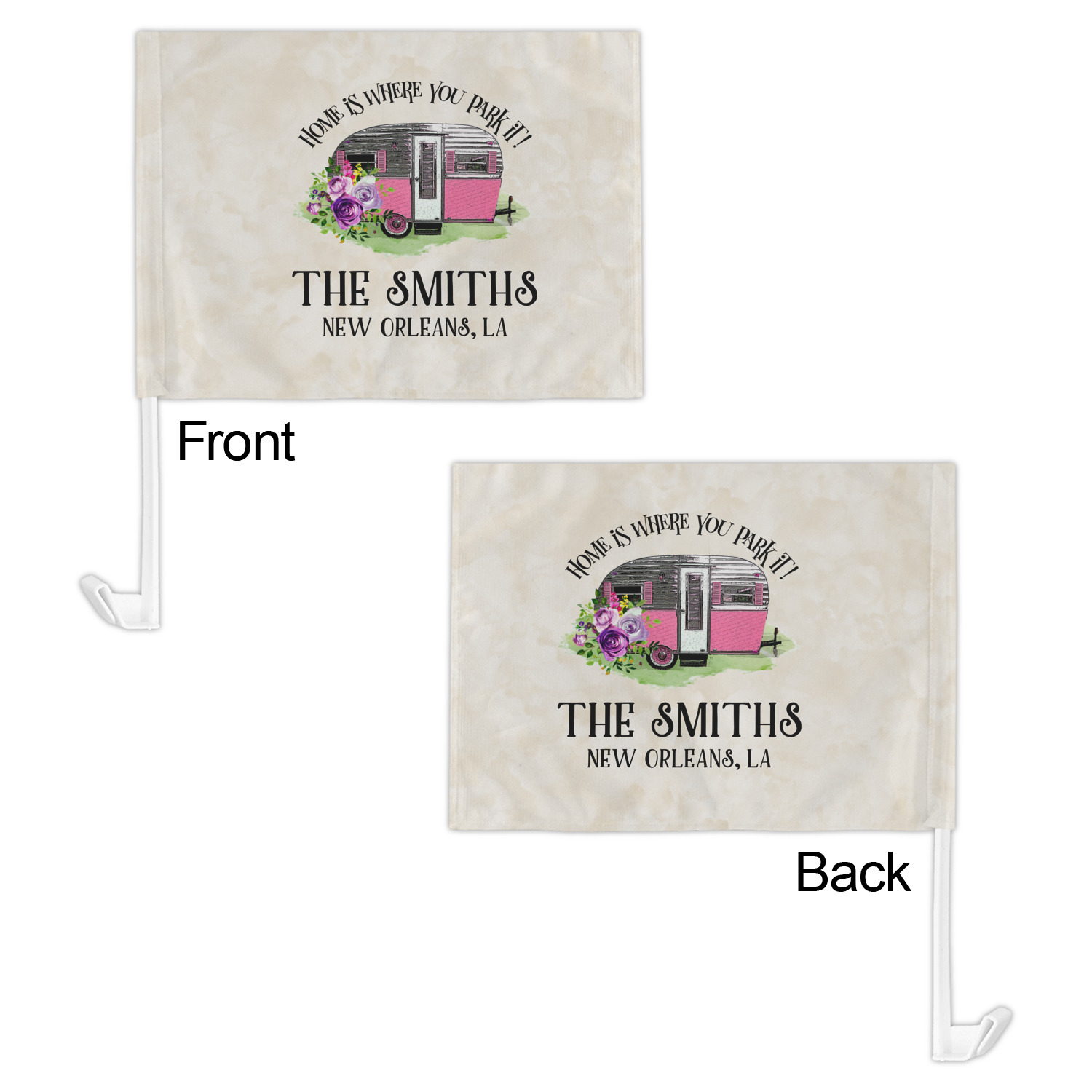 Our personalized flags are made from a durable, yet lightweight cloth that will proudly bear your logo or design of choice, while withstanding the outside elements. We have two size options - 8" x 11" and 11" x 15". Both come with a flag pole which includes a clip that secures the pole to the side window, whether it is rolled up or down. The flags are printed on both sides to display your design from all directions.