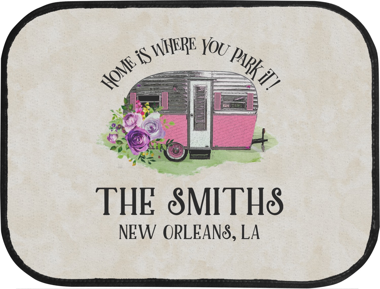 This fun design is absolutely stunning. The background is a subtle tan watercolor texture. The main graphic is an adorable pink trailer camper with sweet flowers all around it. The phrase going above it says "Home is where you park it!" You can easily personalize the text to say the place and date of a specific camping trip you always want to remember.