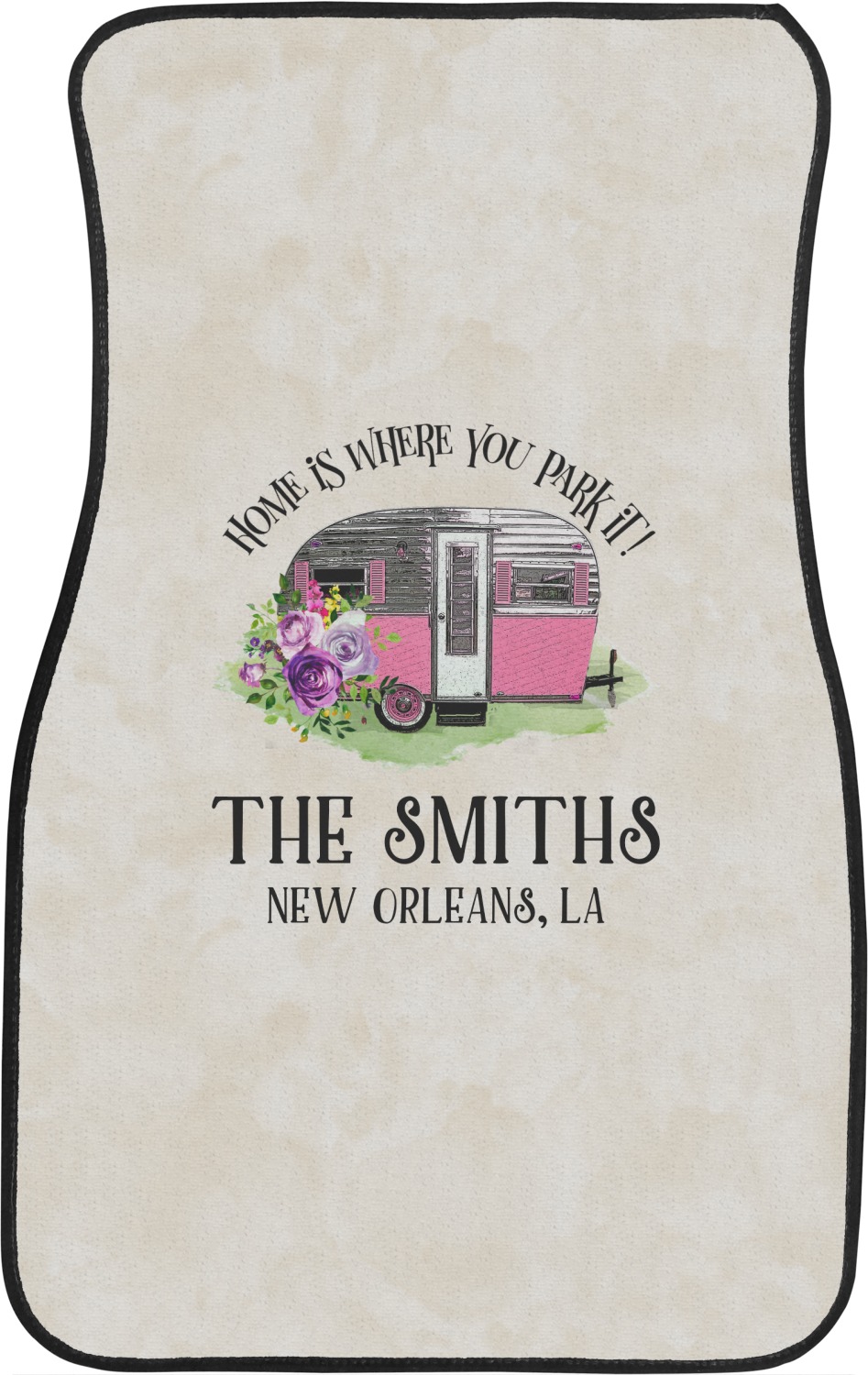 This fun design is absolutely stunning. The background is a subtle tan watercolor texture. The main graphic is an adorable pink trailer camper with sweet flowers all around it. The phrase going above it says "Home is where you park it!" You can easily personalize the text to say the place and date of a specific camping trip you always want to remember.