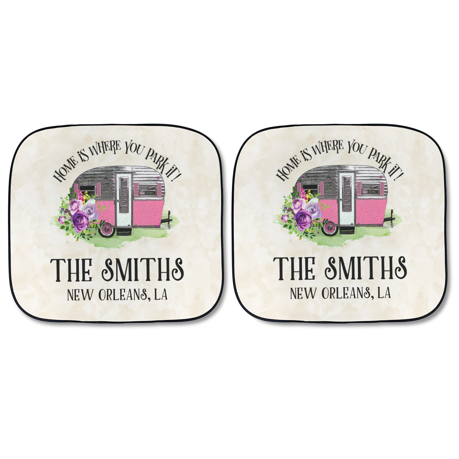 This fun design is absolutely stunning. The background is a subtle tan watercolor texture. The main graphic is an adorable pink trailer camper with sweet flowers all around it. The phrase going above it says "Home is where you park it!" You can easily personalize the text to say the place and date of a specific camping trip you always want to remember.
