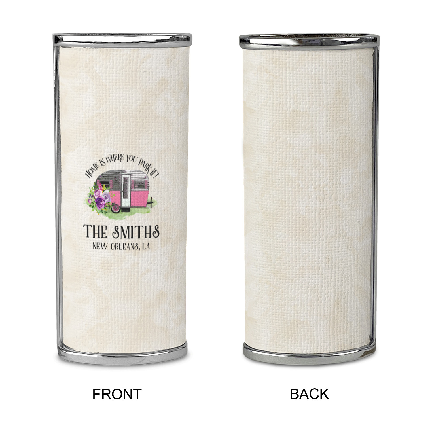 This fun design is absolutely stunning. The background is a subtle tan watercolor texture. The main graphic is an adorable pink trailer camper with sweet flowers all around it. The phrase going above it says "Home is where you park it!" You can easily personalize the text to say the place and date of a specific camping trip you always want to remember.
