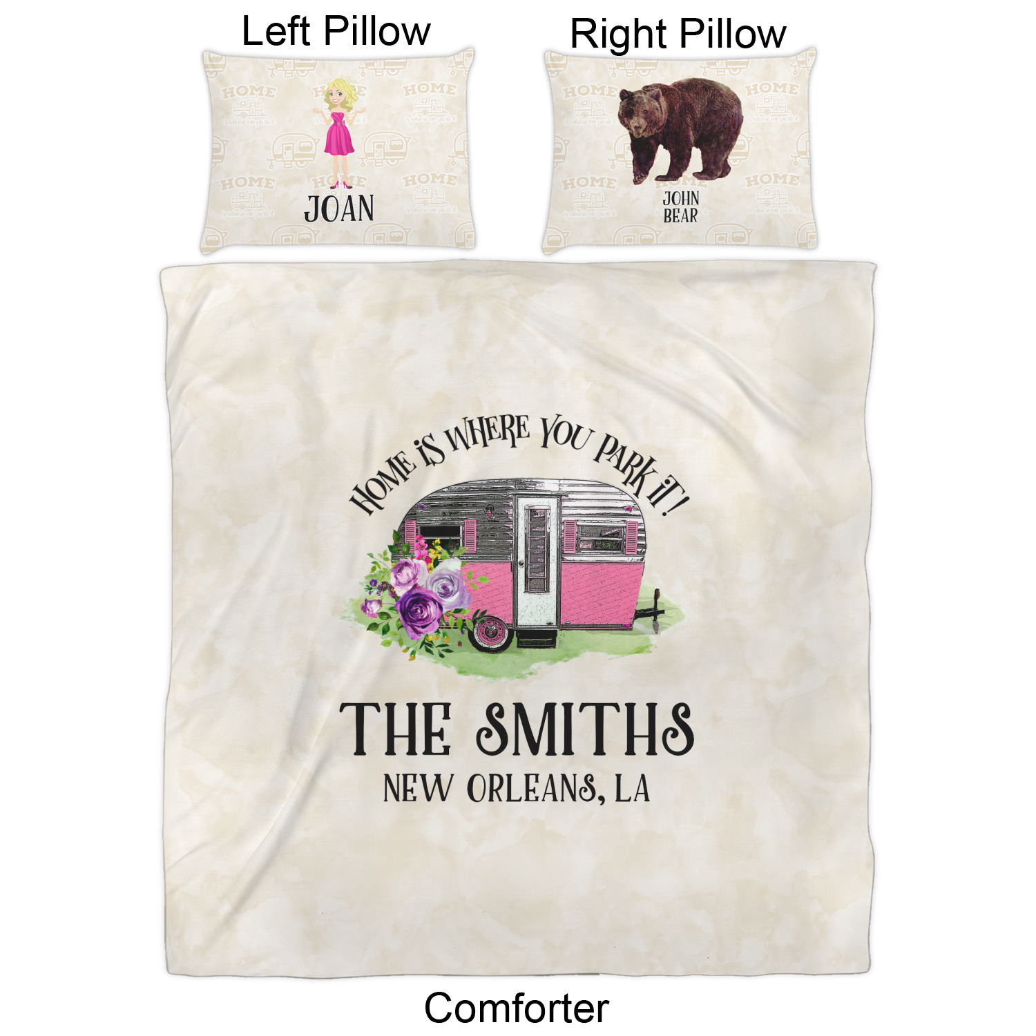We have hundreds of different design templates for you to choose from Each design can be customized to your exact specifications. Not only can you customize the comforter, but you can also customize each pillow sham e.g. for a queen comforter set you have have Mr & Mrs pillow shams with the last name on comforter.