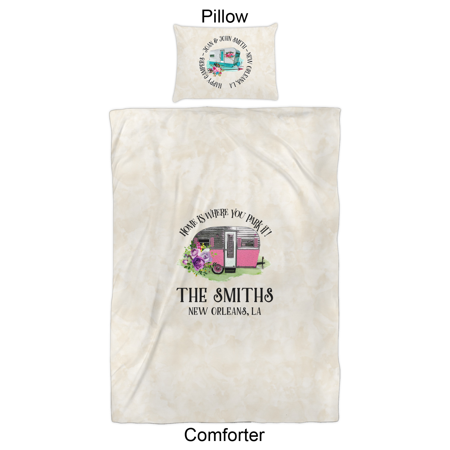 We have hundreds of different design templates for you to choose from Each design can be customized to your exact specifications. Not only can you customize the comforter, but you can also customize each pillow sham e.g. for a queen comforter set you have have Mr & Mrs pillow shams with the last name on comforter.