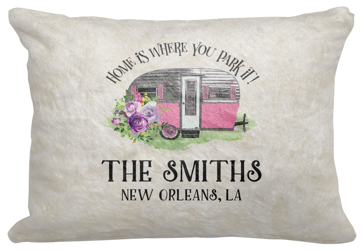 This fun design is absolutely stunning. The background is a subtle tan watercolor texture. The main graphic is an adorable pink trailer camper with sweet flowers all around it. The phrase going above it says "Home is where you park it!" You can easily personalize the text to say the place and date of a specific camping trip you always want to remember.