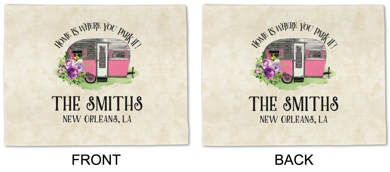 This fun design is absolutely stunning. The background is a subtle tan watercolor texture. The main graphic is an adorable pink trailer camper with sweet flowers all around it. The phrase going above it says "Home is where you park it!" You can easily personalize the text to say the place and date of a specific camping trip you always want to remember.