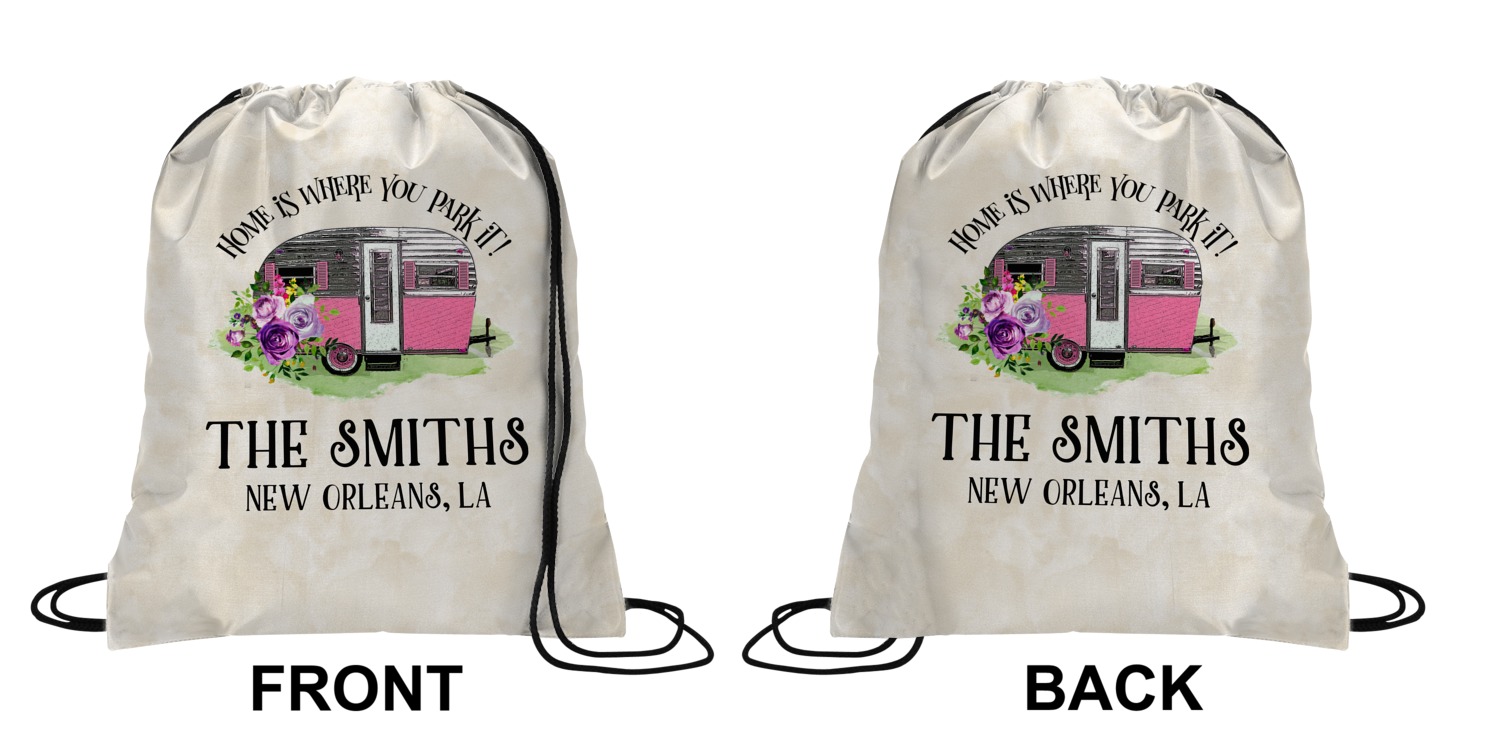 This fun design is absolutely stunning. The background is a subtle tan watercolor texture. The main graphic is an adorable pink trailer camper with sweet flowers all around it. The phrase going above it says "Home is where you park it!" You can easily personalize the text to say the place and date of a specific camping trip you always want to remember.