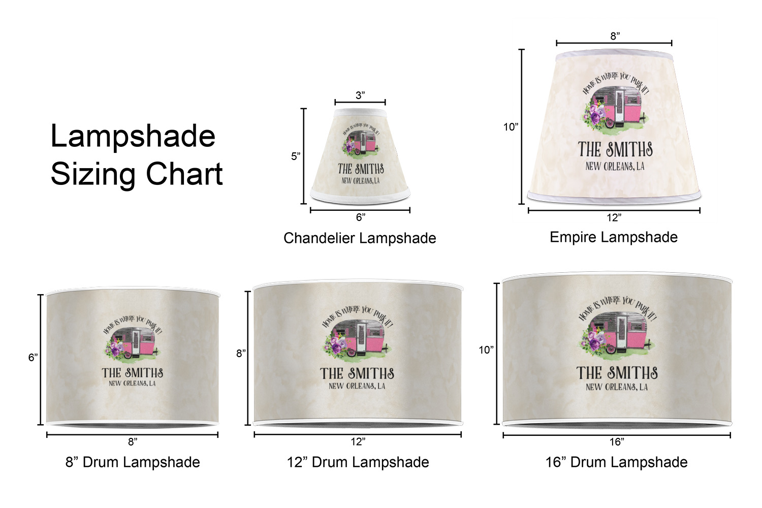 Our customized lamp shades also come in 3 different sizes: 8", 12" and 16", measuring at 8" in diameter by 6" tall, 12" in diameter by 8" tall, and 16" in diameter by 10" tall, respectively.