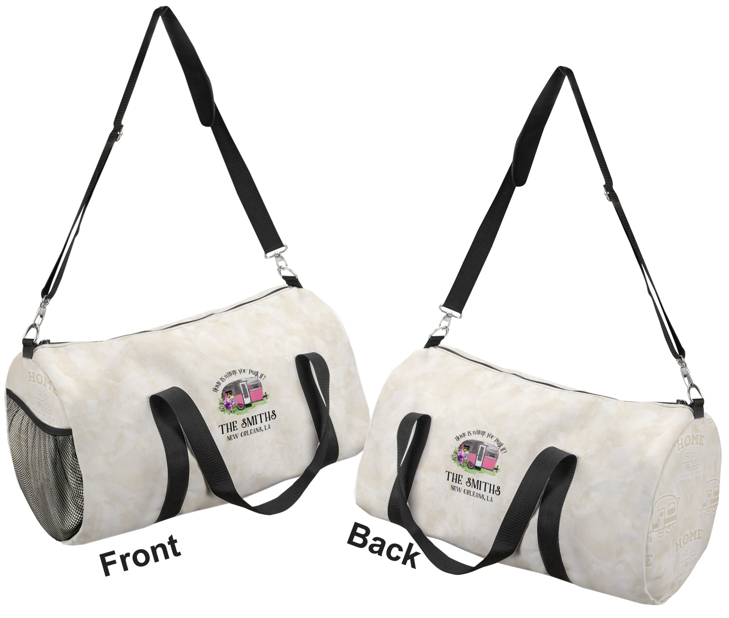 This duffle is a sturdy bag made of a canvas material. It comes in two sizes: Small (19"W x 9.5"H x 9.5"D) and Large (23"W x 12"H x 12"D). The bag is a cylindrical shape with a black adjustable strap and two handles. On one side is an elastic pouch to put a waterbottle or other small item. Your product will be sublimated with your design and is able to be designed on the front, back, and sides. Be sure to remember that the straps may cut into parts of your design if you upload your own artwork.