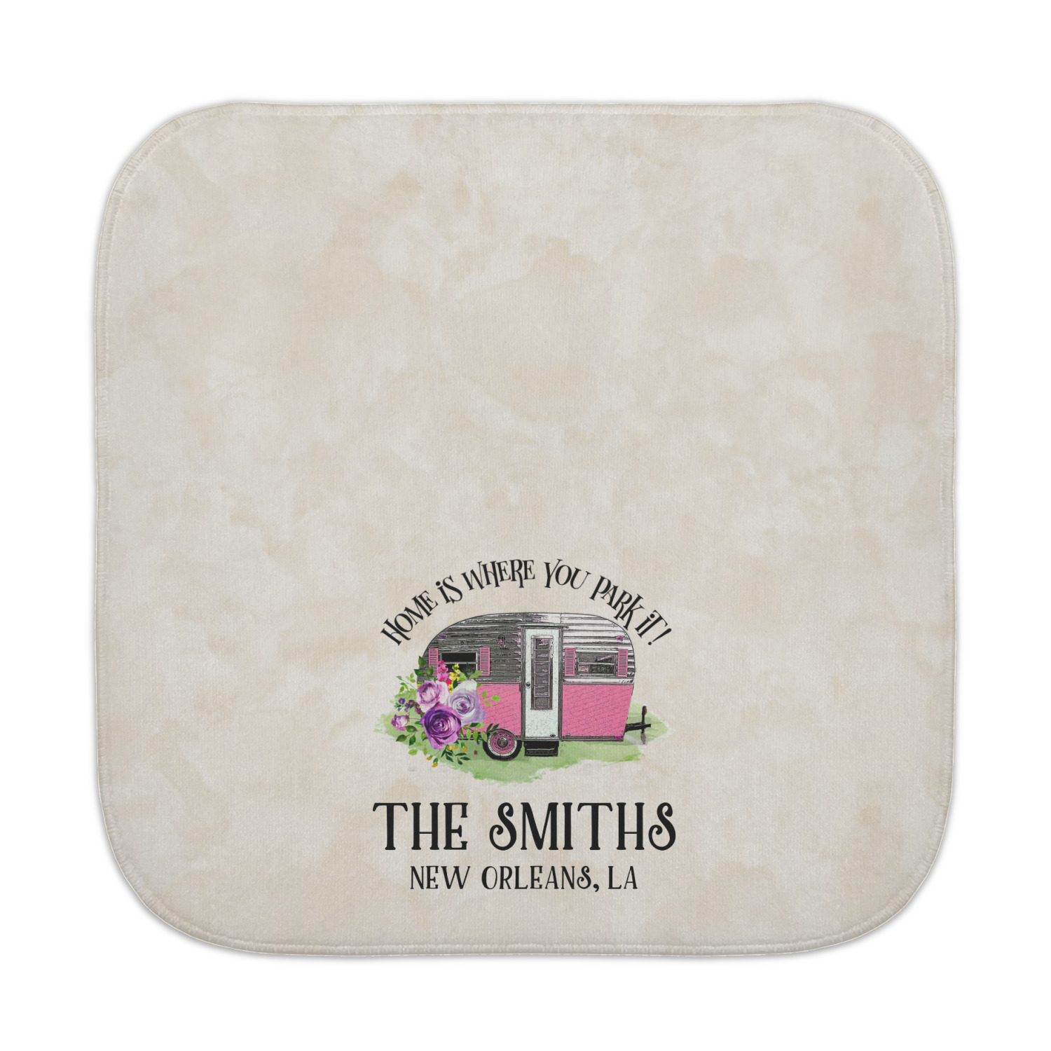 This fun design is absolutely stunning. The background is a subtle tan watercolor texture. The main graphic is an adorable pink trailer camper with sweet flowers all around it. The phrase going above it says "Home is where you park it!" You can easily personalize the text to say the place and date of a specific camping trip you always want to remember.