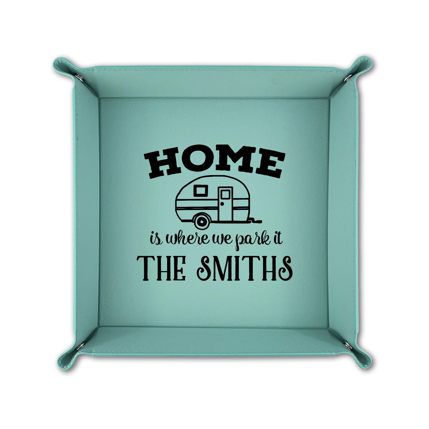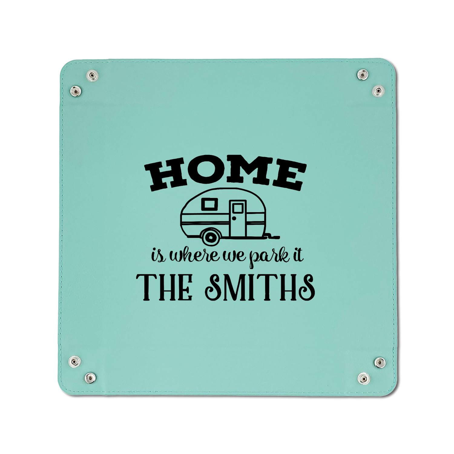 This fun design is absolutely stunning. The background is a subtle tan watercolor texture. The main graphic is an adorable pink trailer camper with sweet flowers all around it. The phrase going above it says "Home is where you park it!" You can easily personalize the text to say the place and date of a specific camping trip you always want to remember.