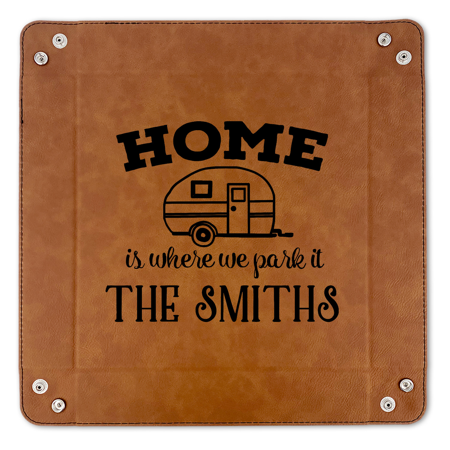 This fun design is absolutely stunning. The background is a subtle tan watercolor texture. The main graphic is an adorable pink trailer camper with sweet flowers all around it. The phrase going above it says "Home is where you park it!" You can easily personalize the text to say the place and date of a specific camping trip you always want to remember.
