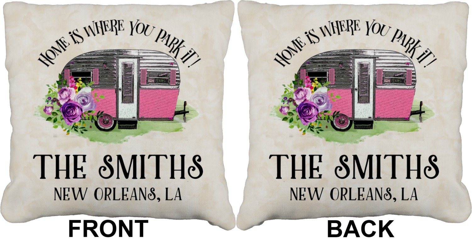 This fun design is absolutely stunning. The background is a subtle tan watercolor texture. The main graphic is an adorable pink trailer camper with sweet flowers all around it. The phrase going above it says "Home is where you park it!" You can easily personalize the text to say the place and date of a specific camping trip you always want to remember.