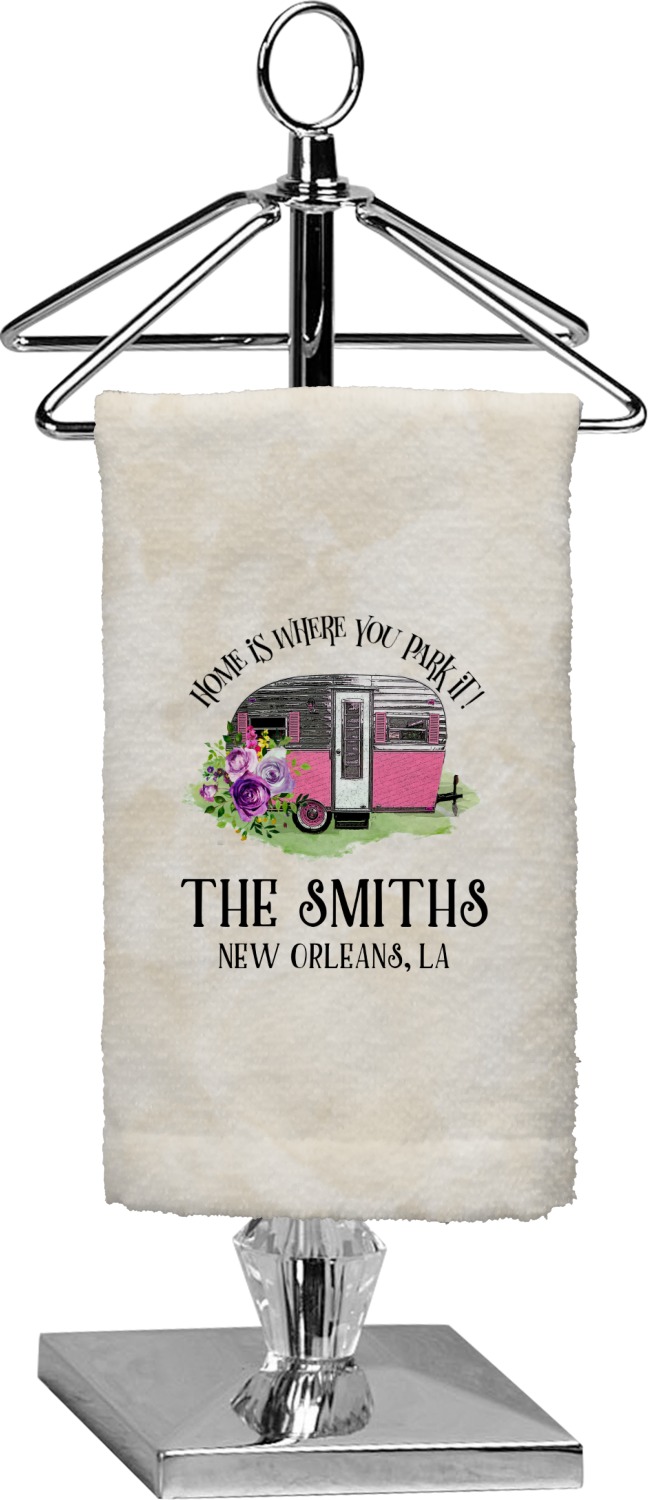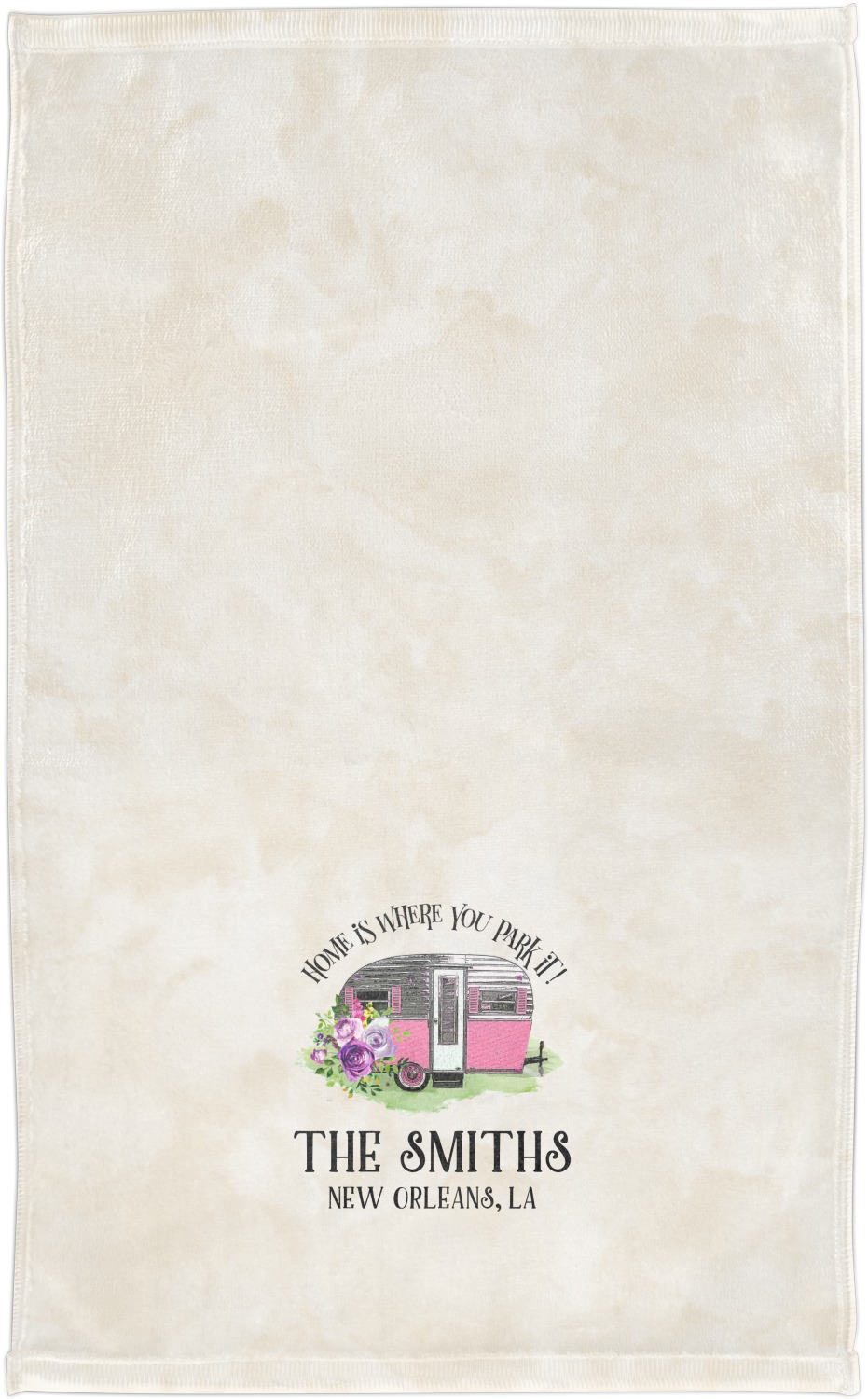 This fun design is absolutely stunning. The background is a subtle tan watercolor texture. The main graphic is an adorable pink trailer camper with sweet flowers all around it. The phrase going above it says "Home is where you park it!" You can easily personalize the text to say the place and date of a specific camping trip you always want to remember.