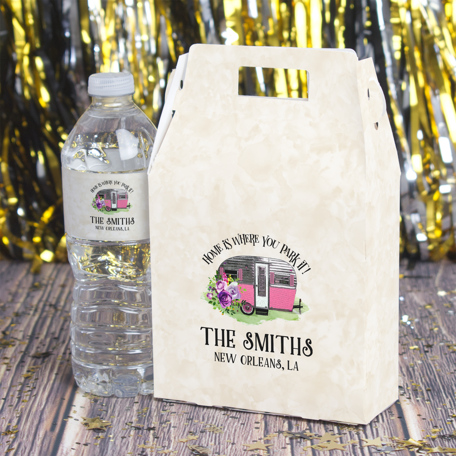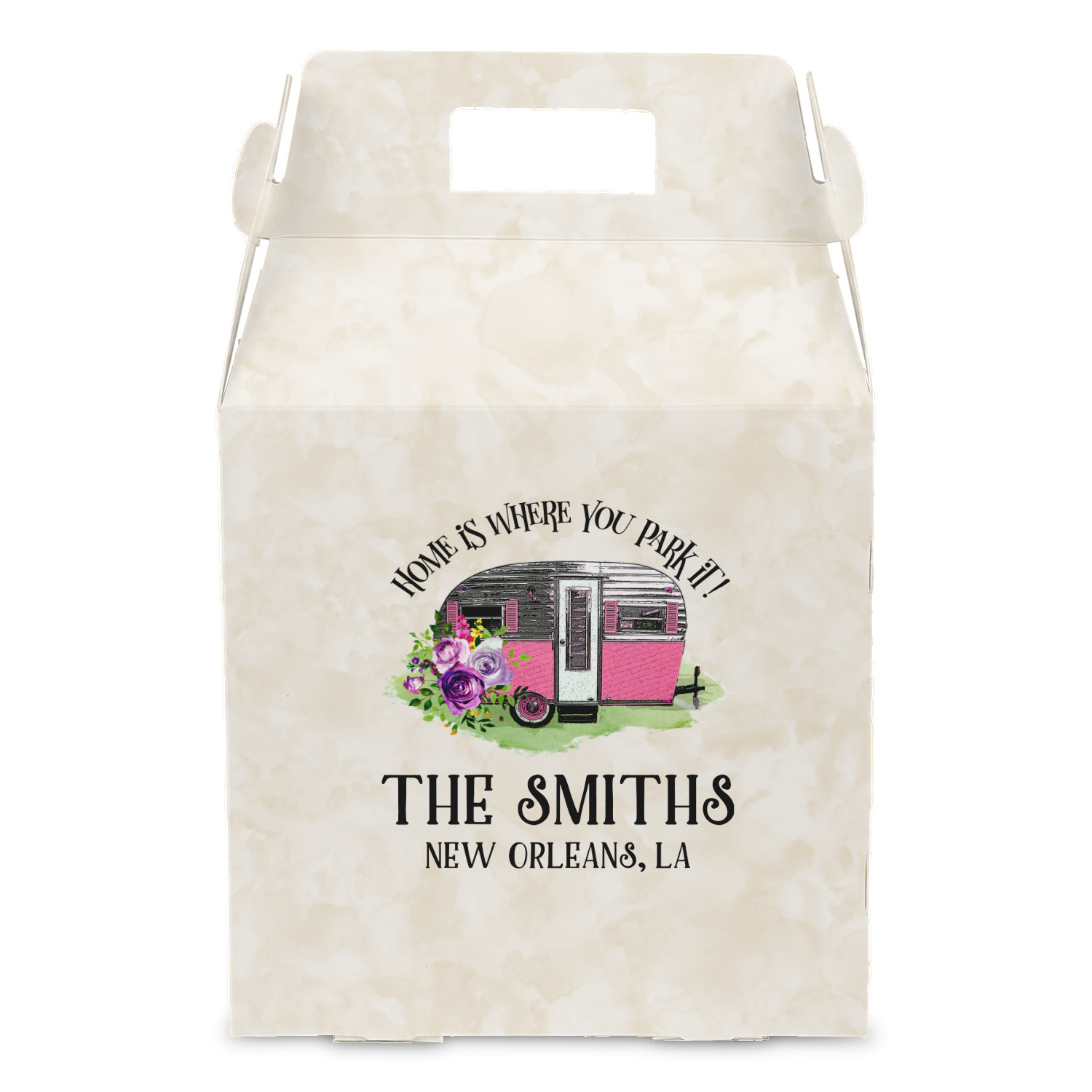 This fun design is absolutely stunning. The background is a subtle tan watercolor texture. The main graphic is an adorable pink trailer camper with sweet flowers all around it. The phrase going above it says "Home is where you park it!" You can easily personalize the text to say the place and date of a specific camping trip you always want to remember.