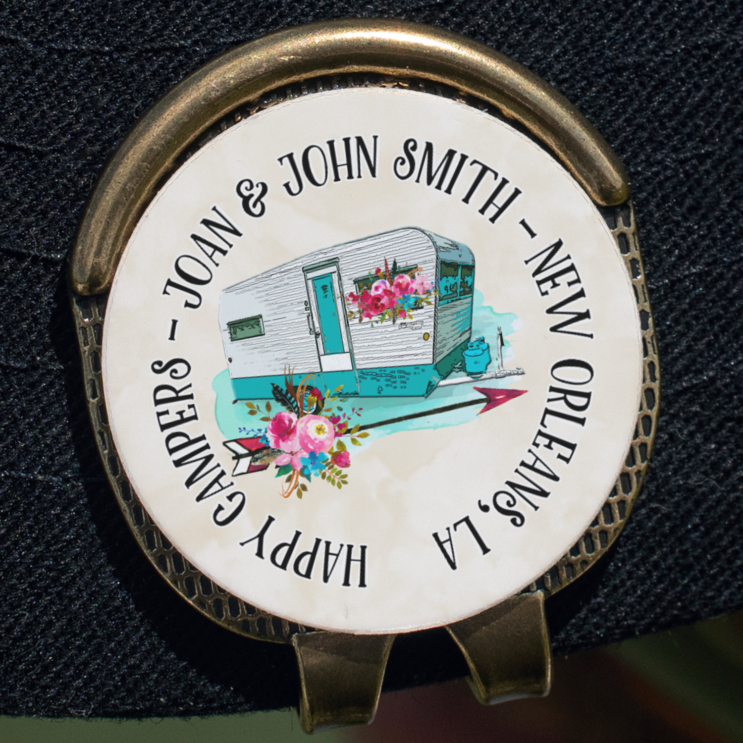 This fun design is absolutely stunning. The background is a subtle tan watercolor texture. The main graphic is an adorable pink trailer camper with sweet flowers all around it. The phrase going above it says "Home is where you park it!" You can easily personalize the text to say the place and date of a specific camping trip you always want to remember.