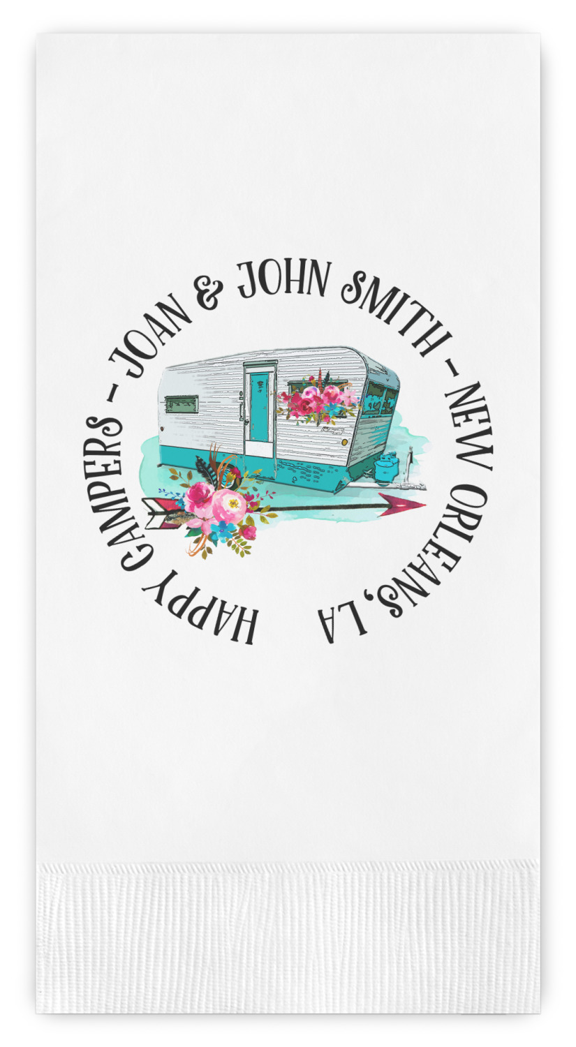This fun design is absolutely stunning. The background is a subtle tan watercolor texture. The main graphic is an adorable pink trailer camper with sweet flowers all around it. The phrase going above it says "Home is where you park it!" You can easily personalize the text to say the place and date of a specific camping trip you always want to remember.