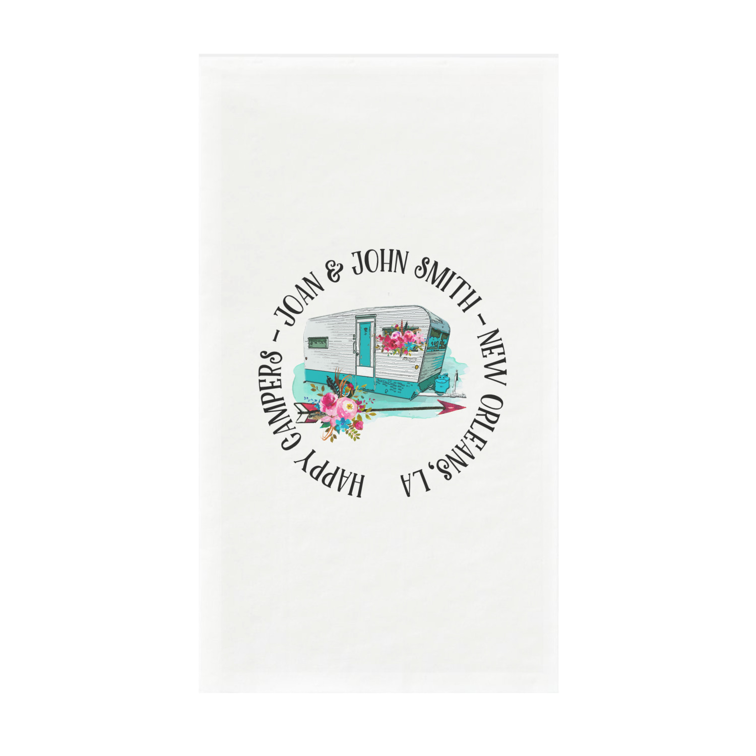This fun design is absolutely stunning. The background is a subtle tan watercolor texture. The main graphic is an adorable pink trailer camper with sweet flowers all around it. The phrase going above it says "Home is where you park it!" You can easily personalize the text to say the place and date of a specific camping trip you always want to remember.