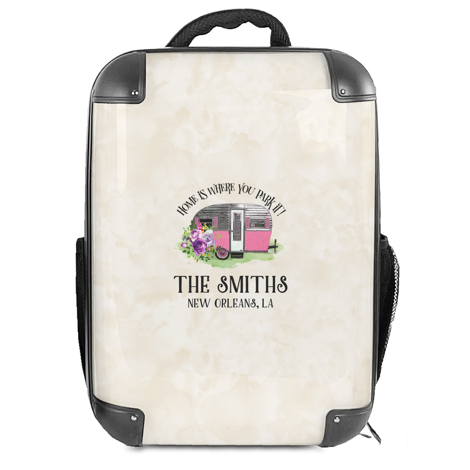 This fun design is absolutely stunning. The background is a subtle tan watercolor texture. The main graphic is an adorable pink trailer camper with sweet flowers all around it. The phrase going above it says "Home is where you park it!" You can easily personalize the text to say the place and date of a specific camping trip you always want to remember.