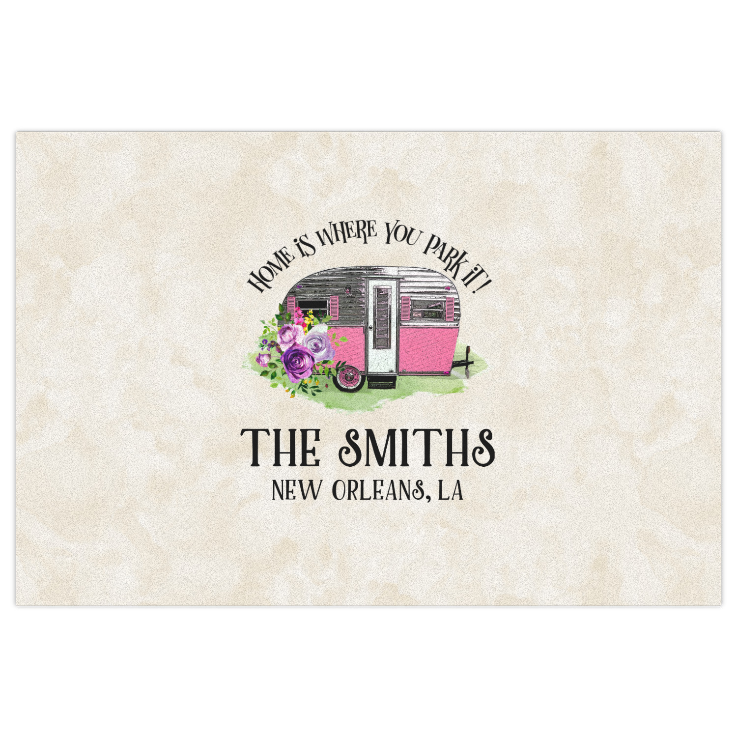 This fun design is absolutely stunning. The background is a subtle tan watercolor texture. The main graphic is an adorable pink trailer camper with sweet flowers all around it. The phrase going above it says "Home is where you park it!" You can easily personalize the text to say the place and date of a specific camping trip you always want to remember.