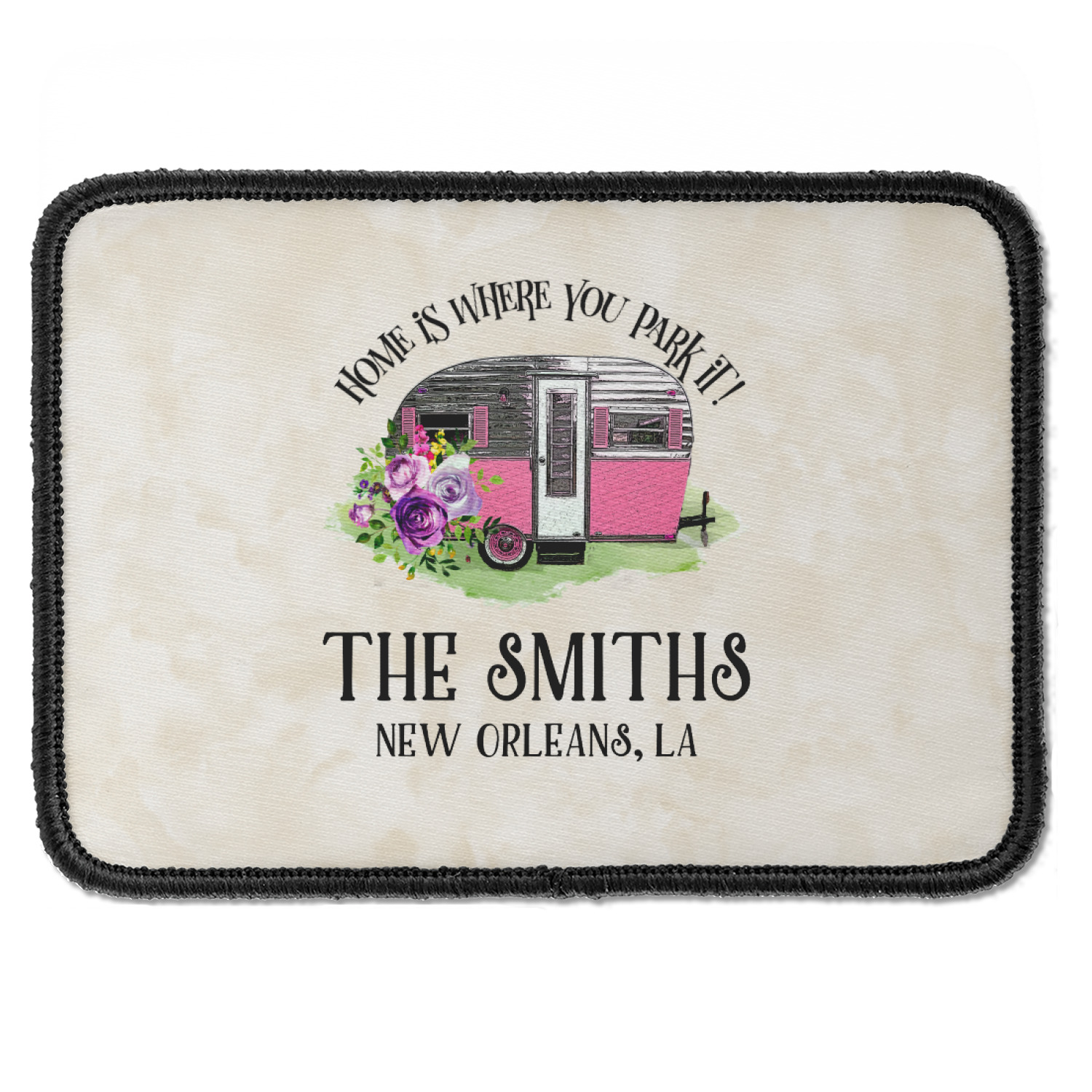 This fun design is absolutely stunning. The background is a subtle tan watercolor texture. The main graphic is an adorable pink trailer camper with sweet flowers all around it. The phrase going above it says "Home is where you park it!" You can easily personalize the text to say the place and date of a specific camping trip you always want to remember.