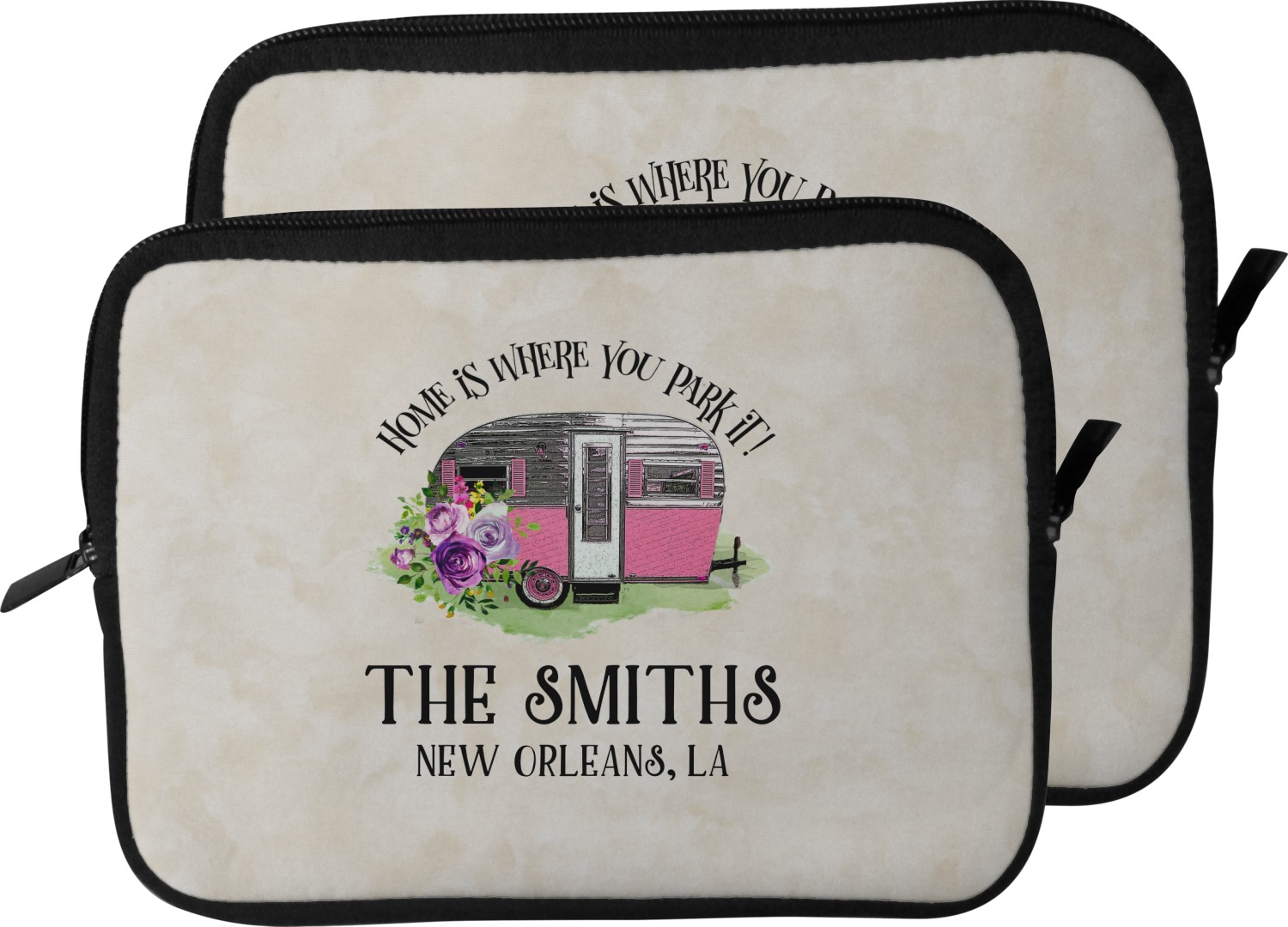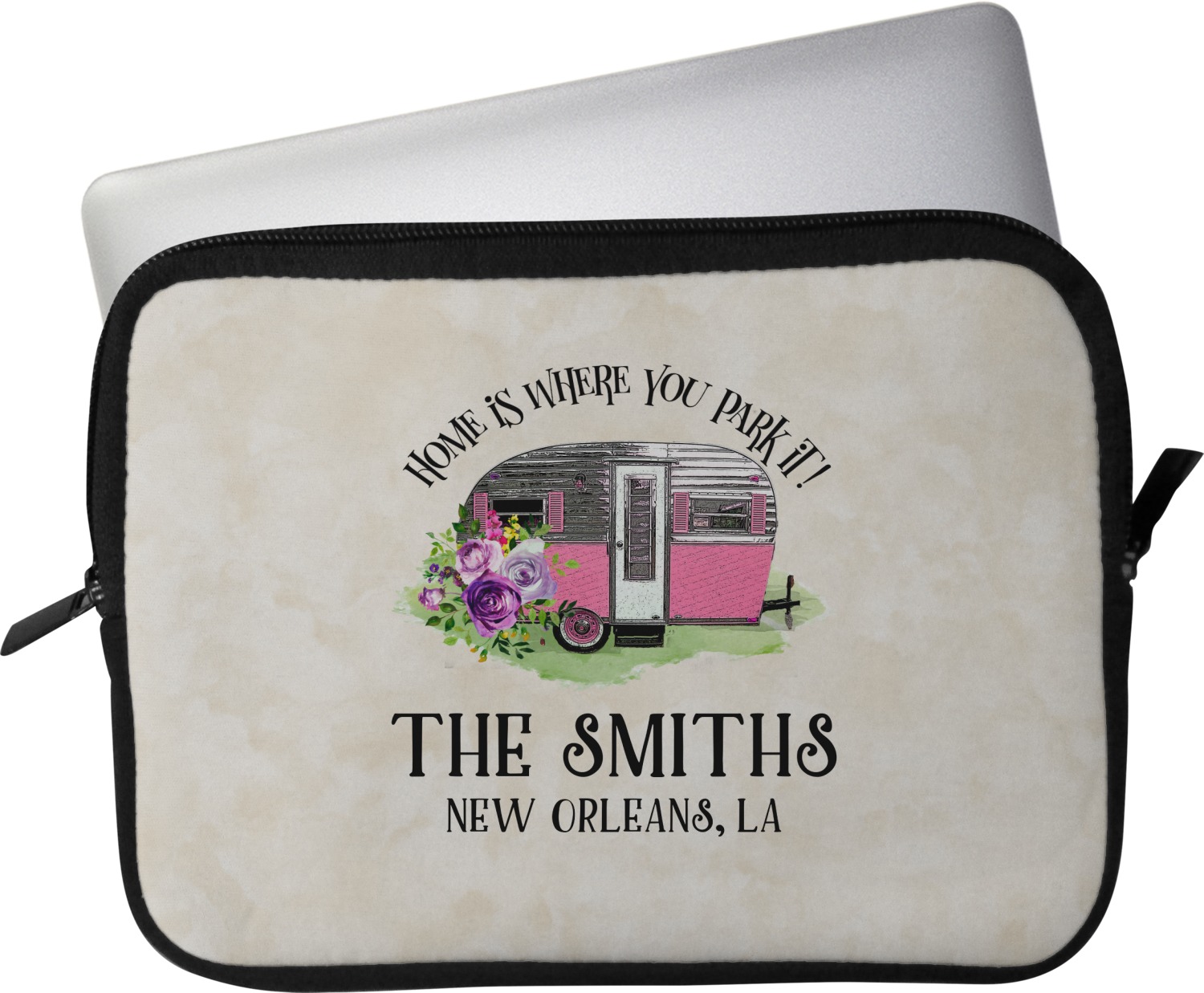 These laptop covers are built from a water-resistant, cushioned neoprene. We display your personalized design on the front of this computer sleeve, while the other sides are simply the black color of the neoprene fabric. A zipper lines the top half of this case, for direct access to your device. For added protection, the interior of this neoprene laptop sleeve is lined with a padded, minky-like material.