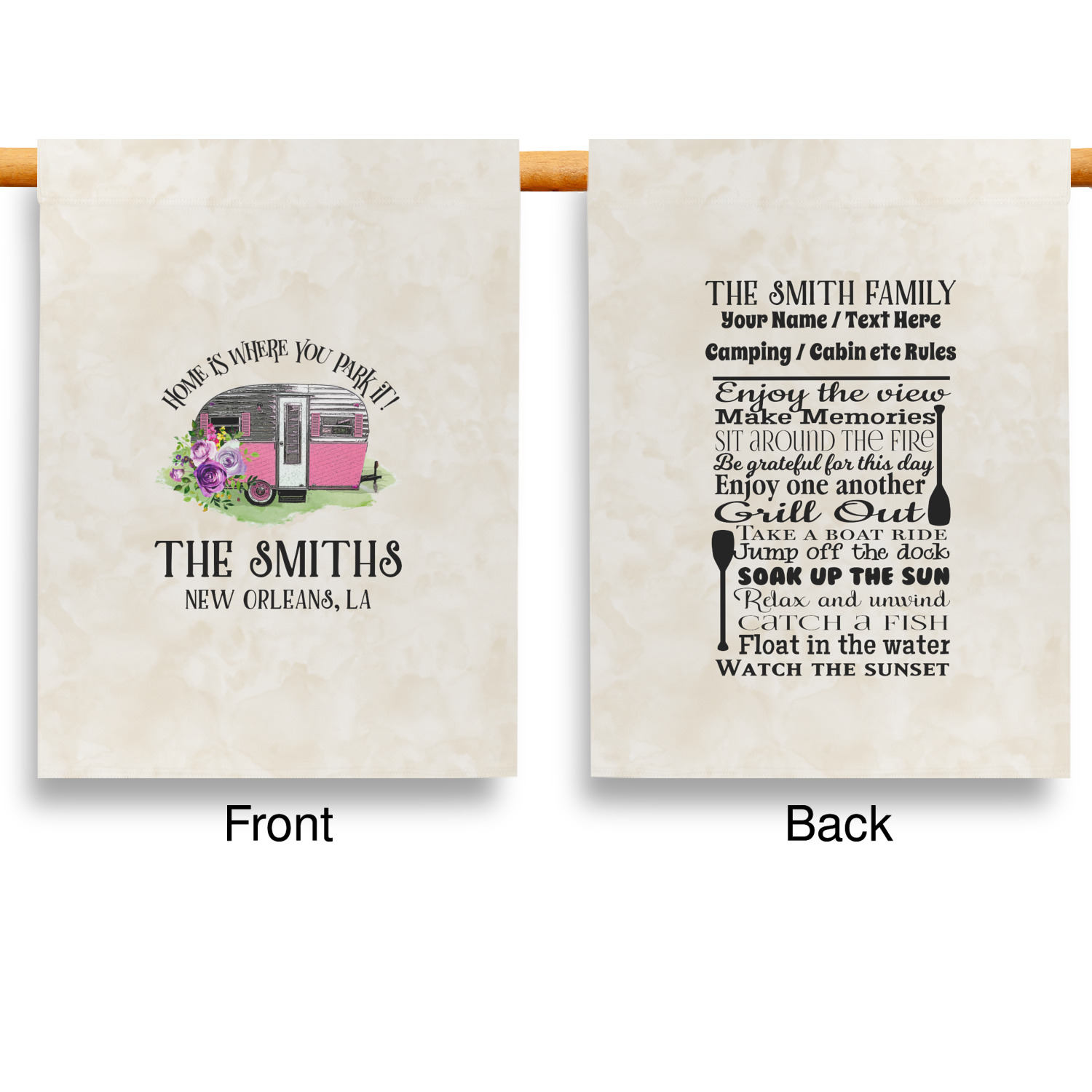 These custom garden flags are made of a durable, double-ply, polyester weave, allowing them to withstand the elements year round. The small flags measure at approximately 12 by 18 inches. The large flags measure out to 28 by 37 inches. You can order these decorative flags with your customization printed on the front only, or the front and back.