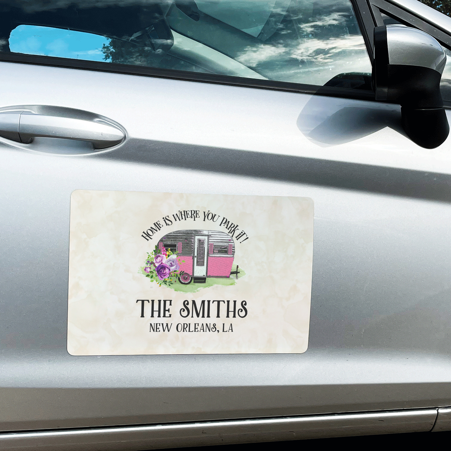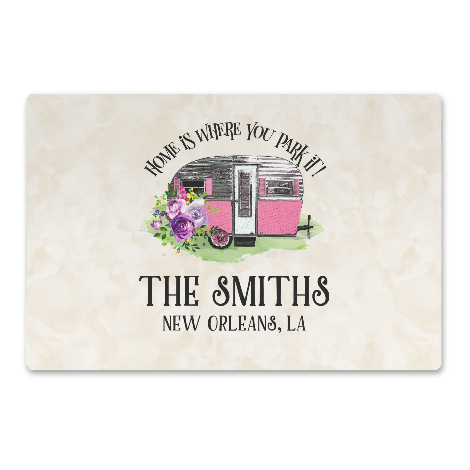 This fun design is absolutely stunning. The background is a subtle tan watercolor texture. The main graphic is an adorable pink trailer camper with sweet flowers all around it. The phrase going above it says "Home is where you park it!" You can easily personalize the text to say the place and date of a specific camping trip you always want to remember.
