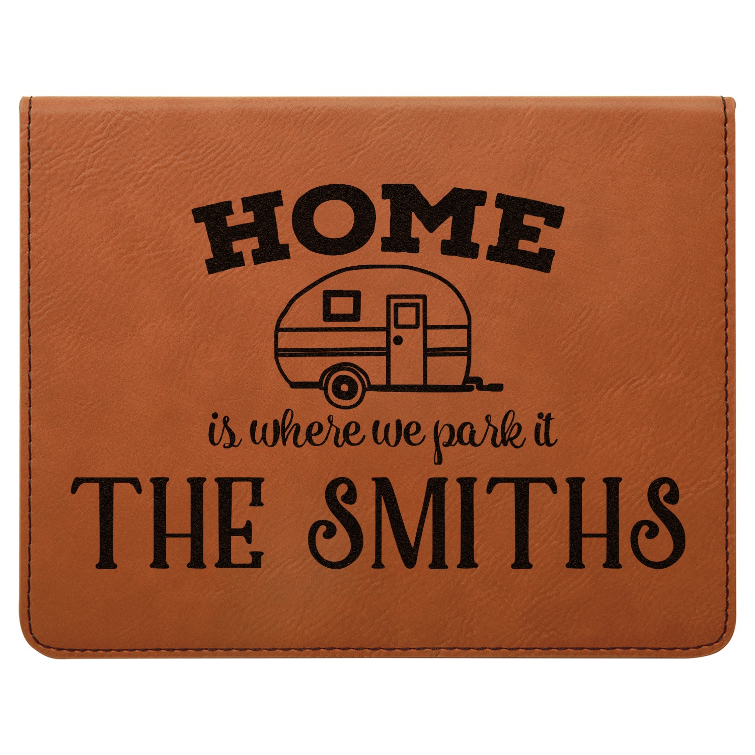 This fun design is absolutely stunning. The background is a subtle tan watercolor texture. The main graphic is an adorable pink trailer camper with sweet flowers all around it. The phrase going above it says "Home is where you park it!" You can easily personalize the text to say the place and date of a specific camping trip you always want to remember.
