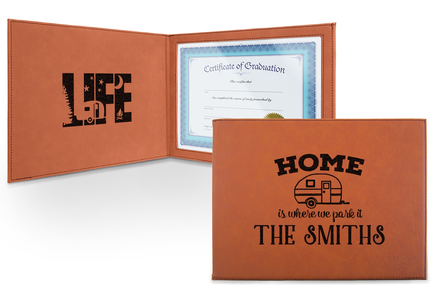 This cognac-colored, leatherette certificate jacket is the ideal way to display or store your hard-earned certificate. When closed, the custom certificate holder measures at 12 by 9 inches. The interior of the certificate cover includes a clear, vinyl window to encase your diploma. The window measures at around 10.5 by 7.5 inches and can accommodate a diploma that measures at up to 8.5 by 11 inches. You can either choose to have your customization laser engraved on the front and interior, or solely the front.