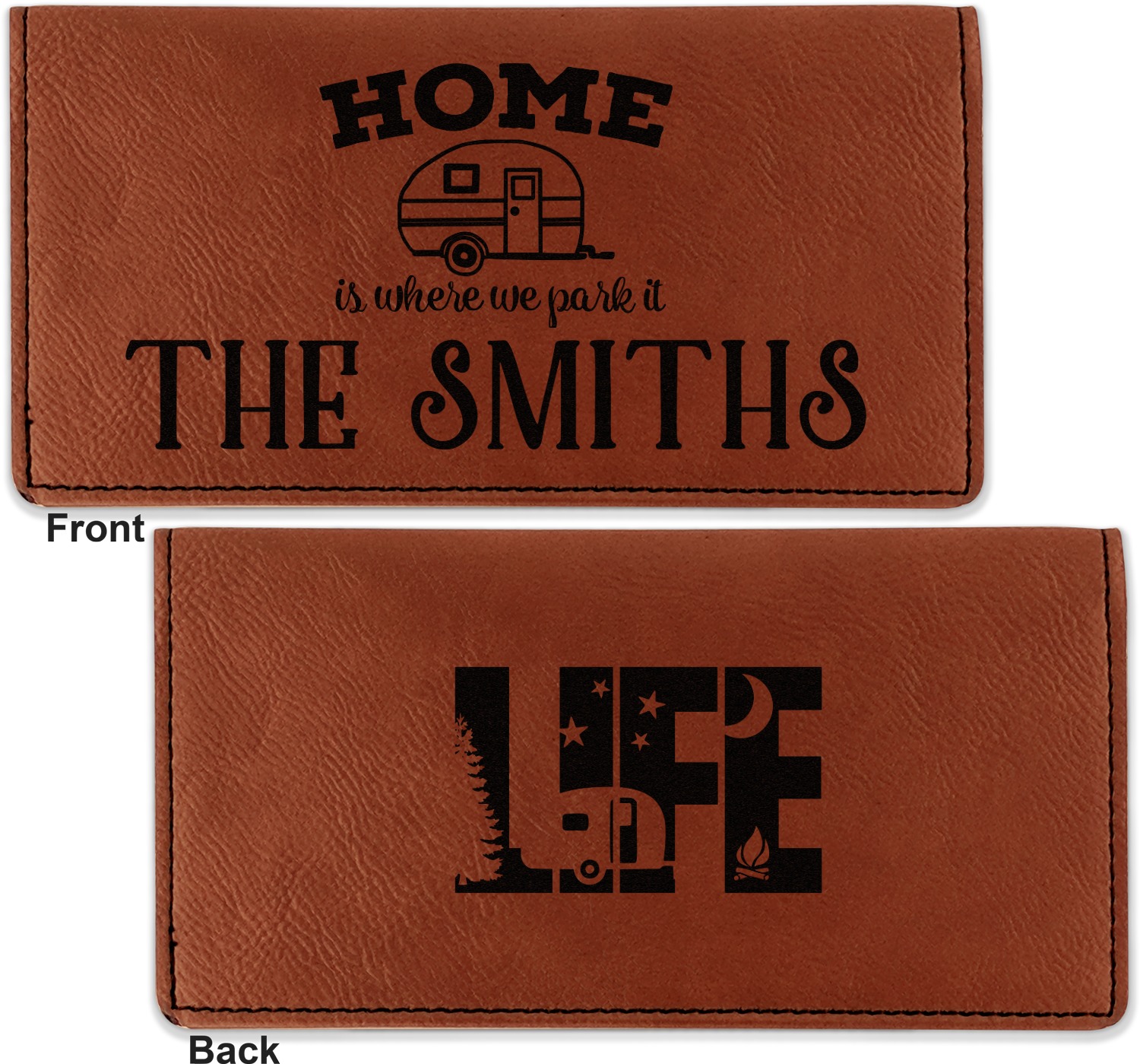 Go into our design center to start personalizing. Your checkbook cover will be laser engraved, making the graphic or text a black color. Choose a fun saying, monogram, or font to go on your checkbook cover. You have the opportunity to do it double or single sided.