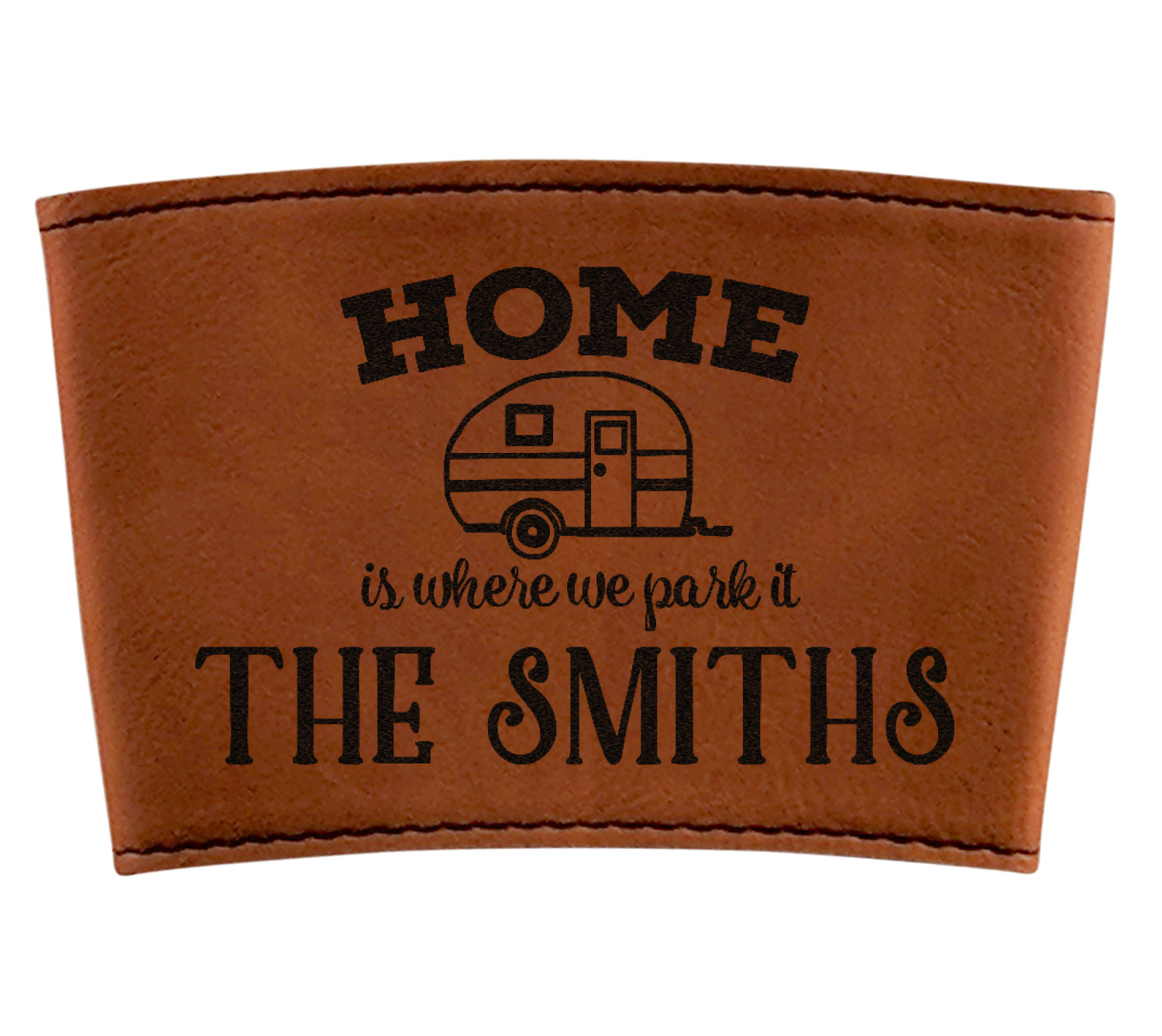 This cup sleeve is made from a suave, cognac-brown leatherette and finished with an intricate, black stitch. The interior of this can sleeve is fabricated from a thin foam material to help insulate your mug's contents. The sleeve is specifically made to suit tapered glasses or mugs, so the top's diameter is 3.5 inches, while the bottom's diameter is 2.75 inches. Your customized design will be laser engraved into the leatherette, leaving behind crisp, black imprint. With these products, we provide you with the option of engraving the front and back, or the front only.