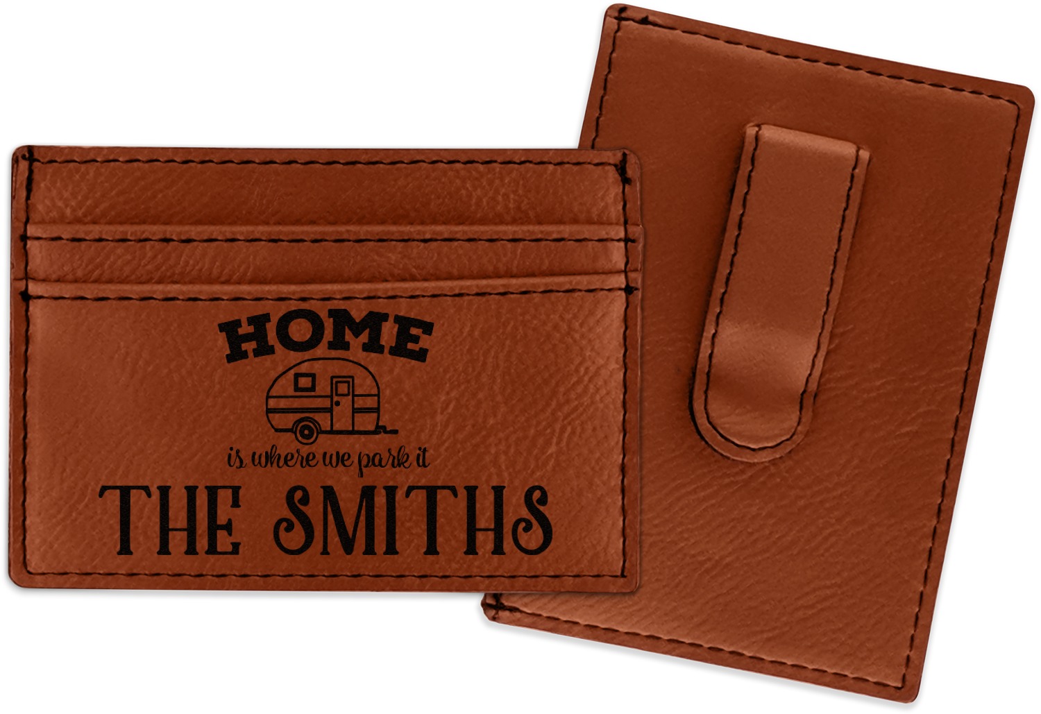 Made from a smooth brown leatherette material, these money clip wallets are the perfect accessory. They measure at approximately 4" x 2.75". On one side there is a money clip where you can slip in your cash. On the other side are three card slots for an ID and credit card or two. The money clip wallet will be laser engraved with your design on the side with the credit card slots. The graphic will come out as a black color.