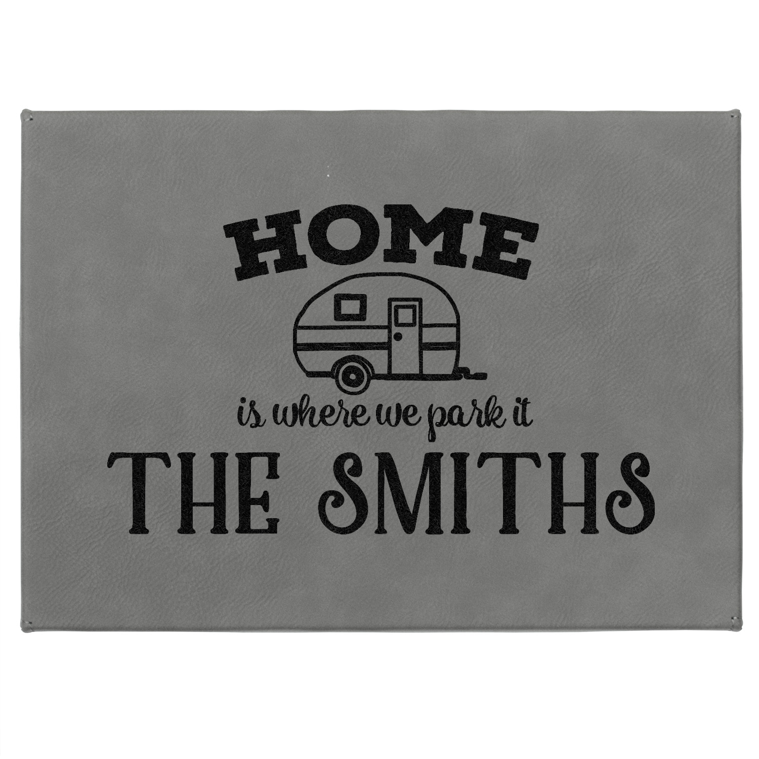 This fun design is absolutely stunning. The background is a subtle tan watercolor texture. The main graphic is an adorable pink trailer camper with sweet flowers all around it. The phrase going above it says "Home is where you park it!" You can easily personalize the text to say the place and date of a specific camping trip you always want to remember.