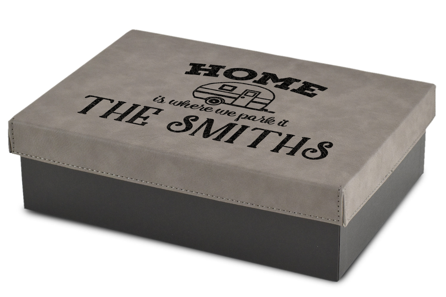 These gift boxes are available in 3 different sizes to accommodate various sized gifts. Available in gray as a neutral color for any occasion as well as to showcase your design boldly. Engraved with a laser this high quality paper board and faux leather gift box is unique and makes any gift stand out.
