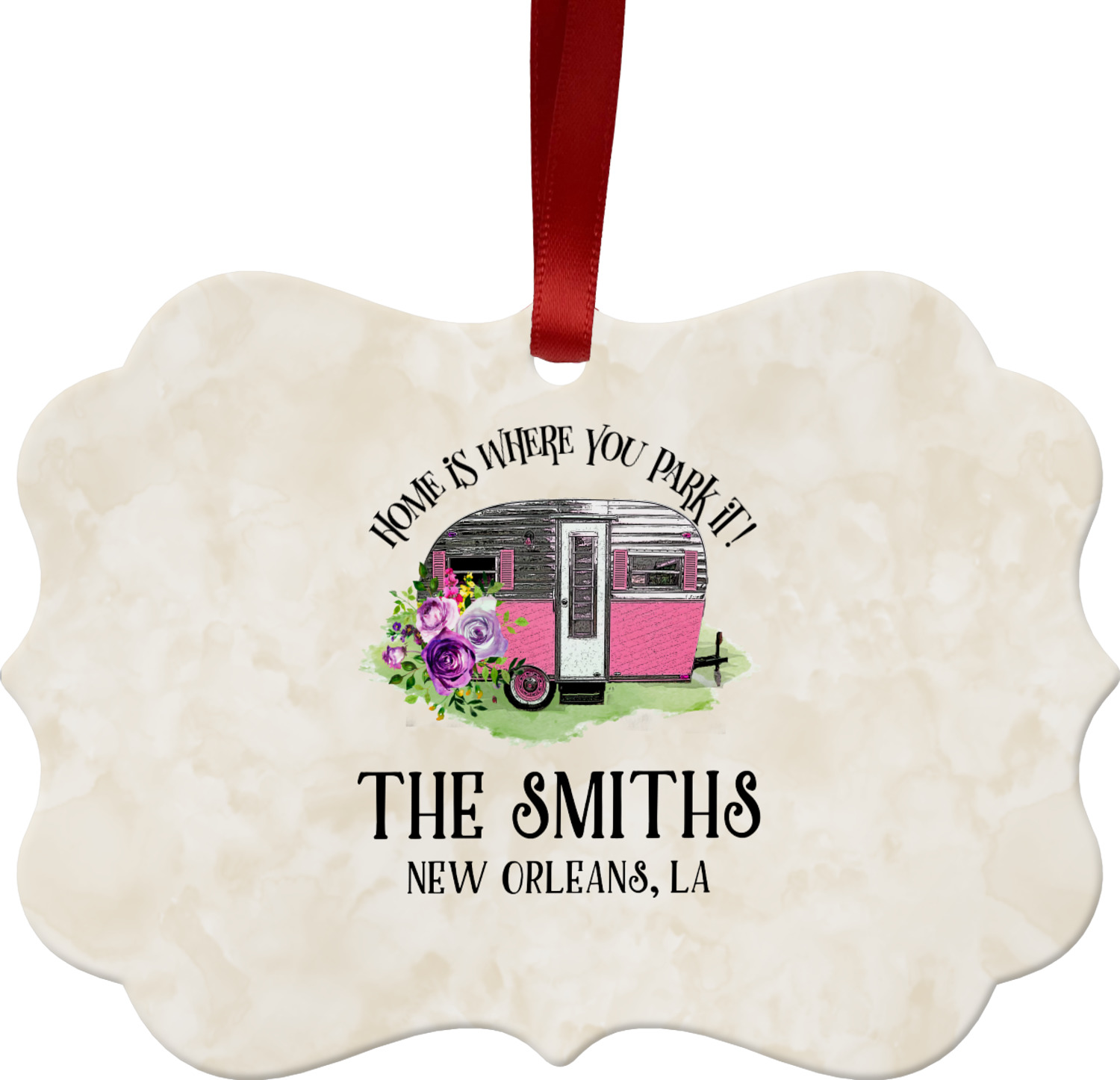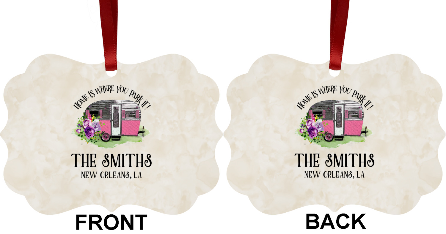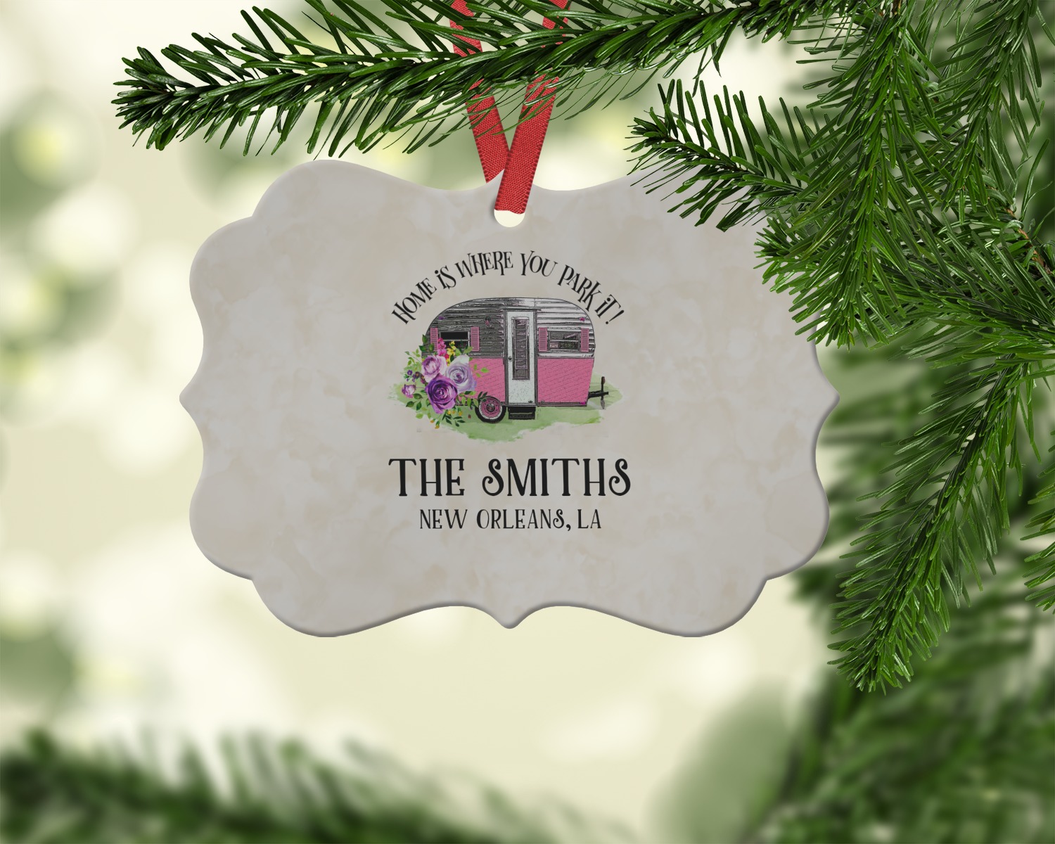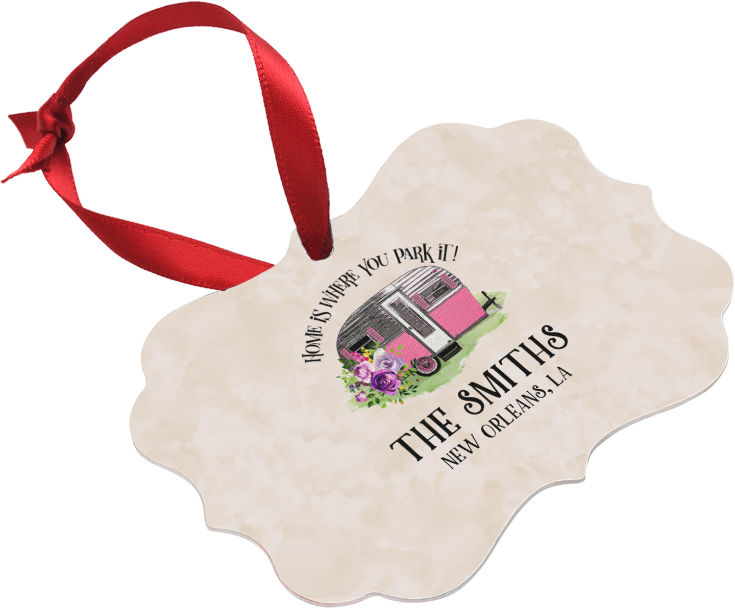 This fun design is absolutely stunning. The background is a subtle tan watercolor texture. The main graphic is an adorable pink trailer camper with sweet flowers all around it. The phrase going above it says "Home is where you park it!" You can easily personalize the text to say the place and date of a specific camping trip you always want to remember.