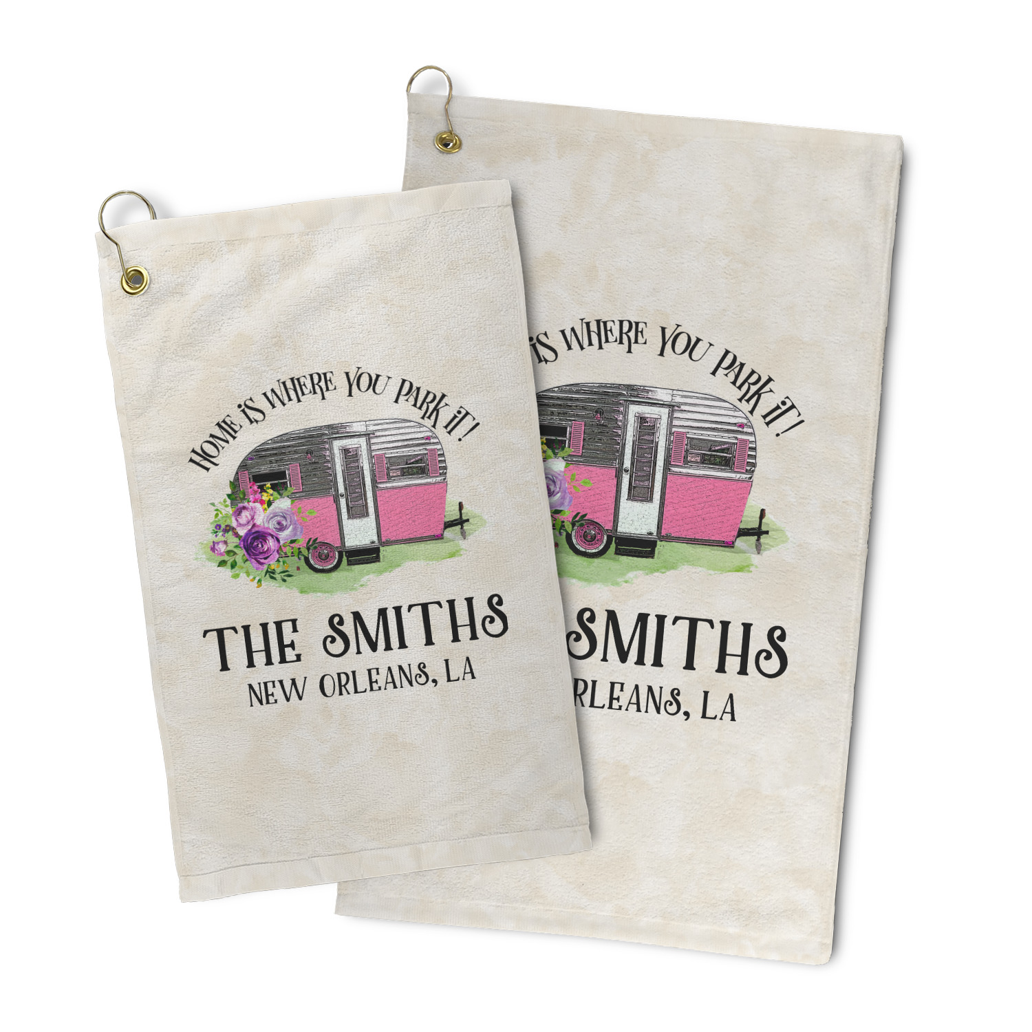 This fun design is absolutely stunning. The background is a subtle tan watercolor texture. The main graphic is an adorable pink trailer camper with sweet flowers all around it. The phrase going above it says "Home is where you park it!" You can easily personalize the text to say the place and date of a specific camping trip you always want to remember.
