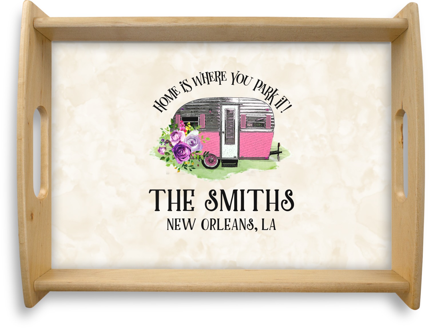 This fun design is absolutely stunning. The background is a subtle tan watercolor texture. The main graphic is an adorable pink trailer camper with sweet flowers all around it. The phrase going above it says "Home is where you park it!" You can easily personalize the text to say the place and date of a specific camping trip you always want to remember.