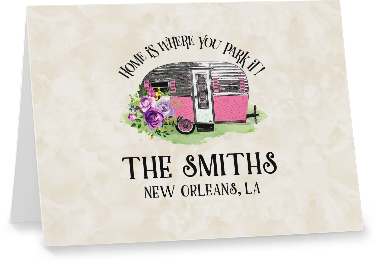 This fun design is absolutely stunning. The background is a subtle tan watercolor texture. The main graphic is an adorable pink trailer camper with sweet flowers all around it. The phrase going above it says "Home is where you park it!" You can easily personalize the text to say the place and date of a specific camping trip you always want to remember.