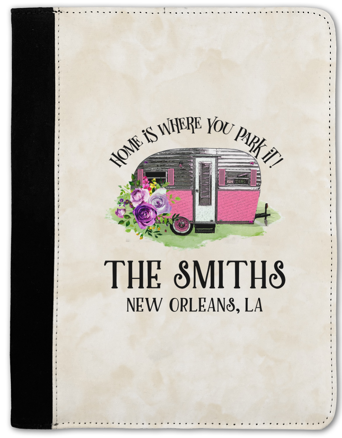 This fun design is absolutely stunning. The background is a subtle tan watercolor texture. The main graphic is an adorable pink trailer camper with sweet flowers all around it. The phrase going above it says "Home is where you park it!" You can easily personalize the text to say the place and date of a specific camping trip you always want to remember.