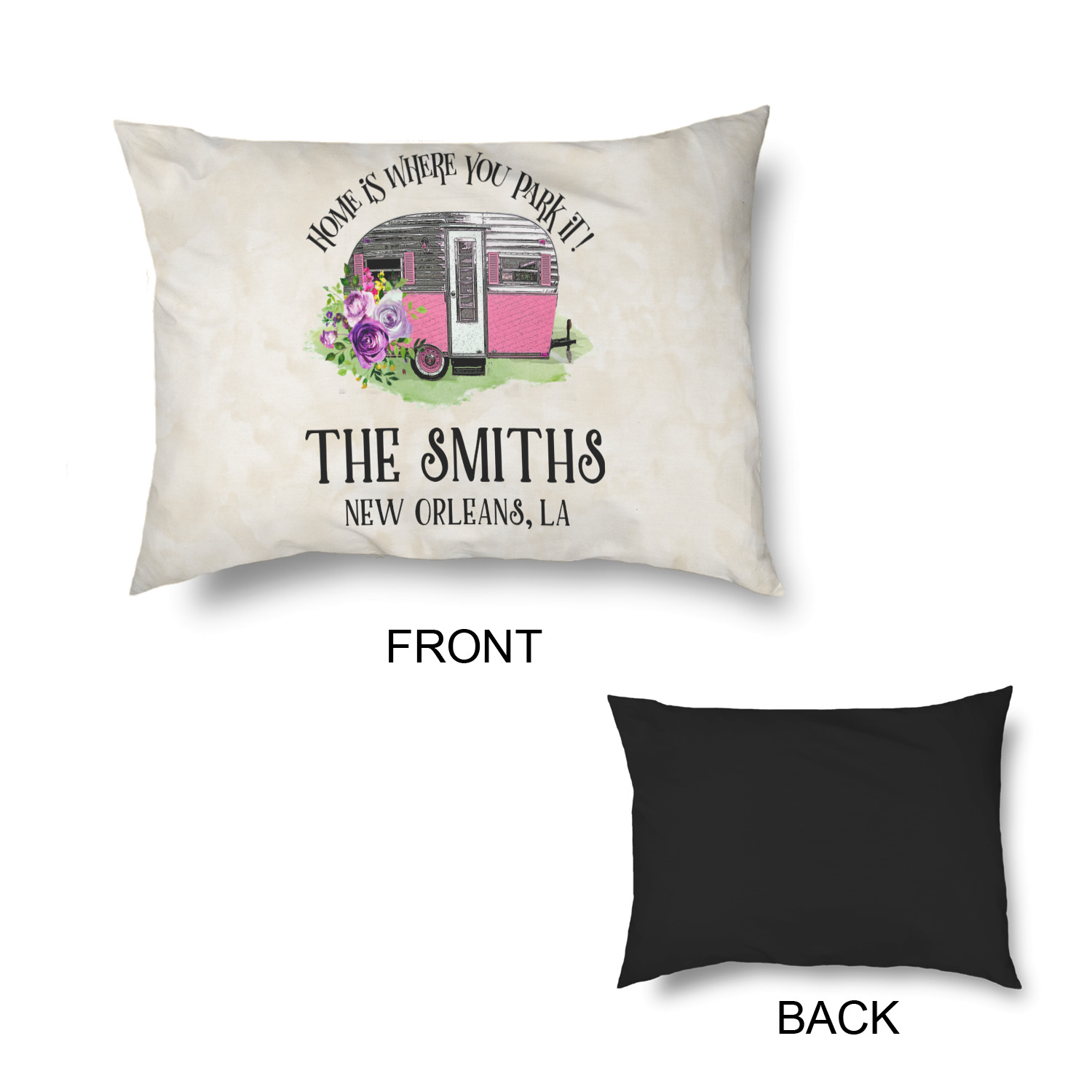 This fun design is absolutely stunning. The background is a subtle tan watercolor texture. The main graphic is an adorable pink trailer camper with sweet flowers all around it. The phrase going above it says "Home is where you park it!" You can easily personalize the text to say the place and date of a specific camping trip you always want to remember.