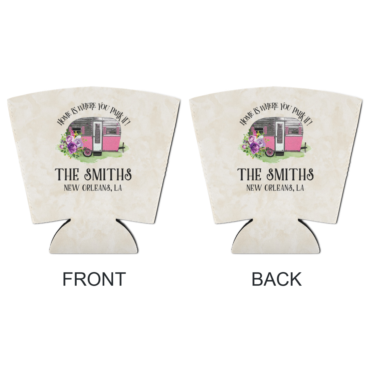 This fun design is absolutely stunning. The background is a subtle tan watercolor texture. The main graphic is an adorable pink trailer camper with sweet flowers all around it. The phrase going above it says "Home is where you park it!" You can easily personalize the text to say the place and date of a specific camping trip you always want to remember.