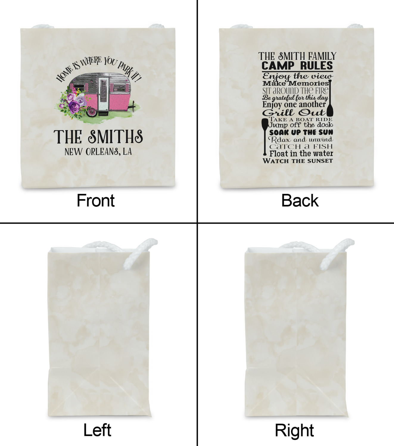 This fun design is absolutely stunning. The background is a subtle tan watercolor texture. The main graphic is an adorable pink trailer camper with sweet flowers all around it. The phrase going above it says "Home is where you park it!" You can easily personalize the text to say the place and date of a specific camping trip you always want to remember.