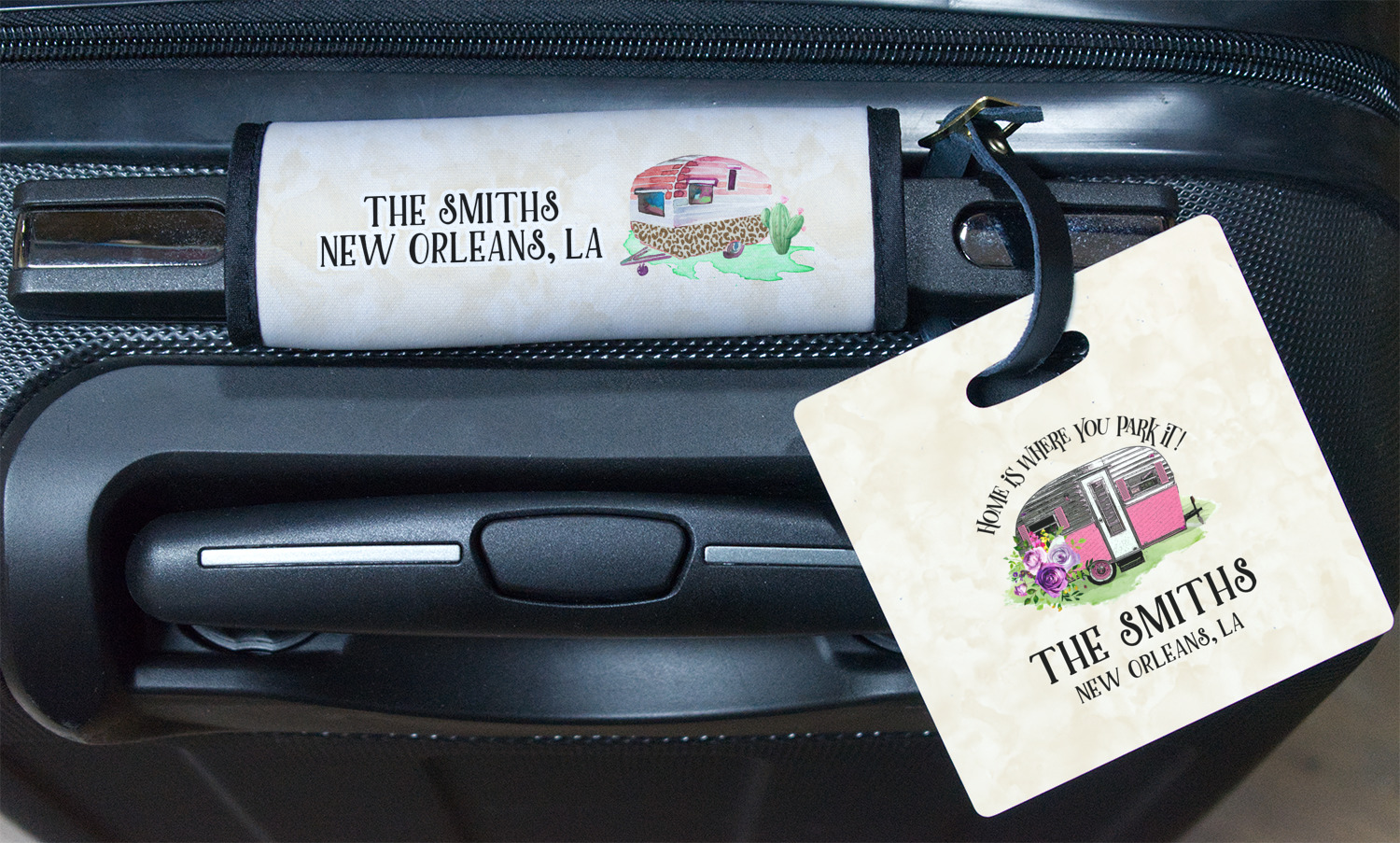 This fun design is absolutely stunning. The background is a subtle tan watercolor texture. The main graphic is an adorable pink trailer camper with sweet flowers all around it. The phrase going above it says "Home is where you park it!" You can easily personalize the text to say the place and date of a specific camping trip you always want to remember.