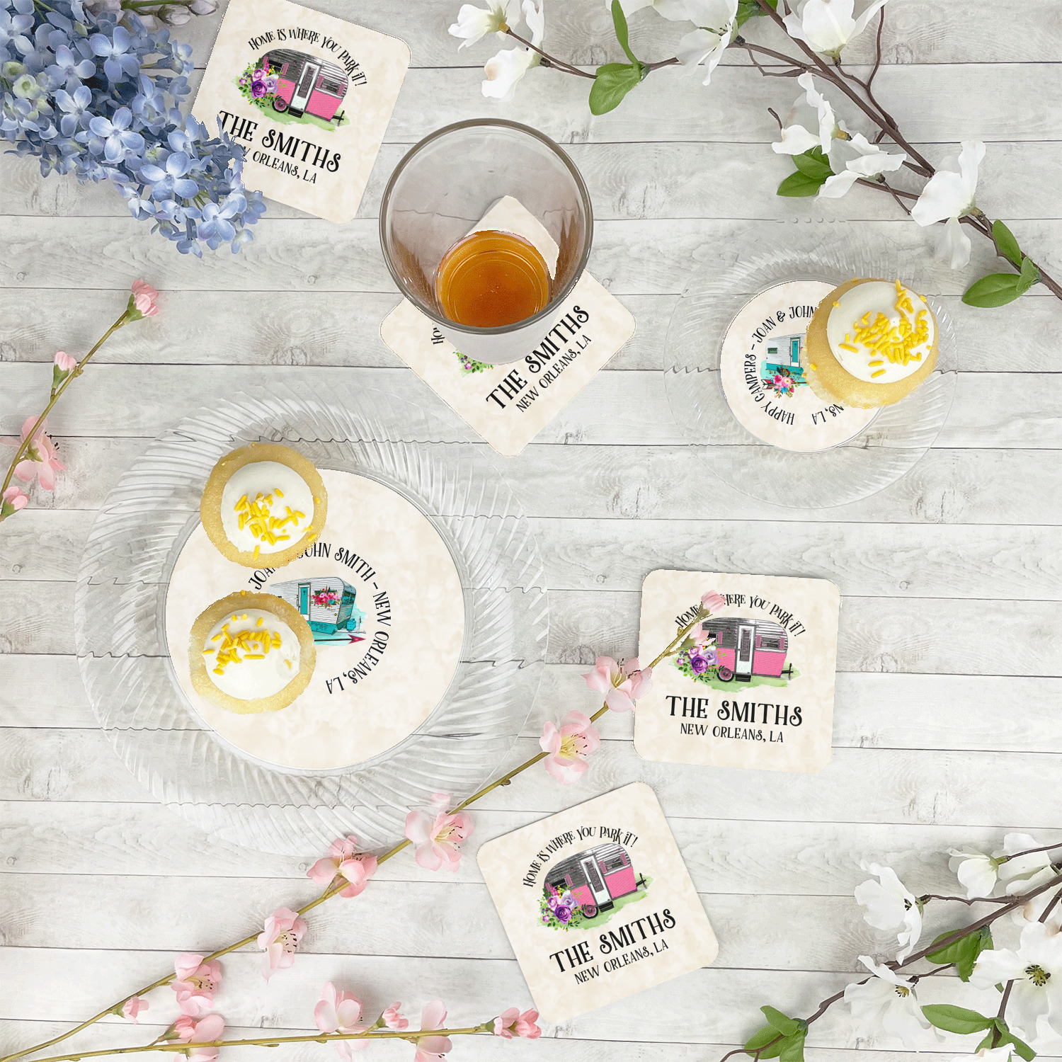 This fun design is absolutely stunning. The background is a subtle tan watercolor texture. The main graphic is an adorable pink trailer camper with sweet flowers all around it. The phrase going above it says "Home is where you park it!" You can easily personalize the text to say the place and date of a specific camping trip you always want to remember.