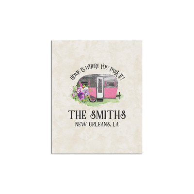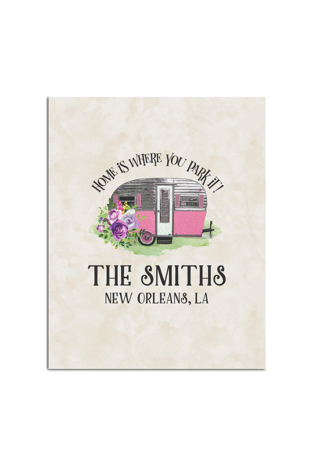 This fun design is absolutely stunning. The background is a subtle tan watercolor texture. The main graphic is an adorable pink trailer camper with sweet flowers all around it. The phrase going above it says "Home is where you park it!" You can easily personalize the text to say the place and date of a specific camping trip you always want to remember.