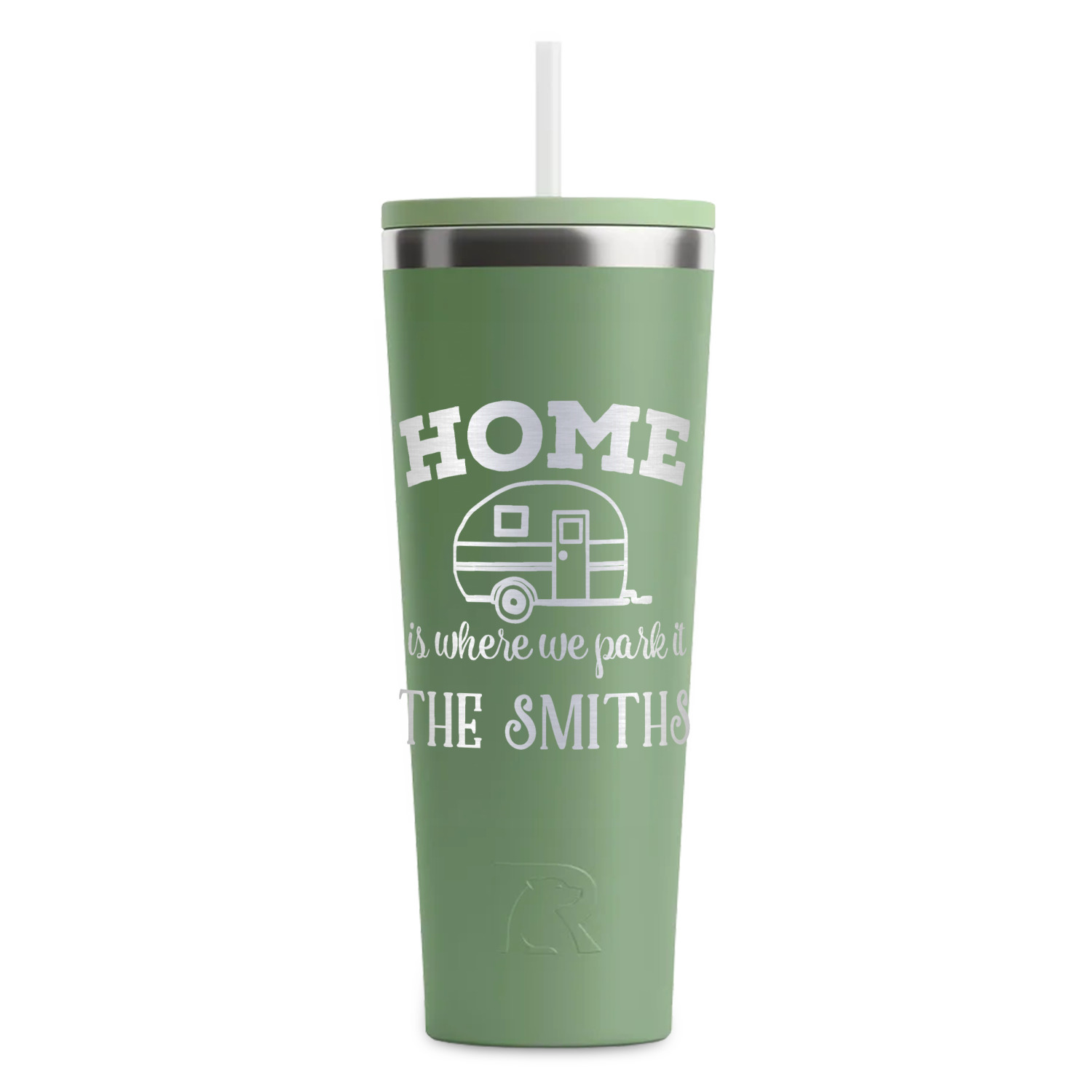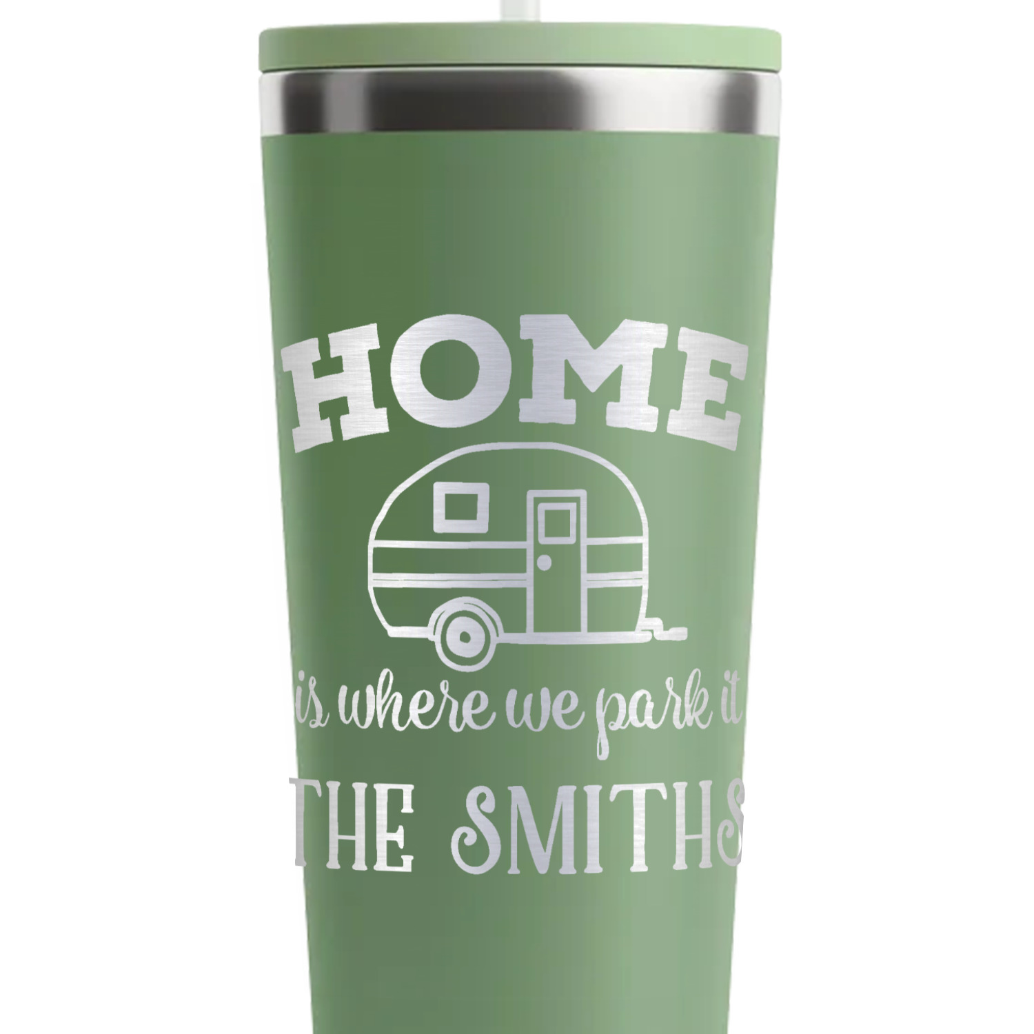 This fun design is absolutely stunning. The background is a subtle tan watercolor texture. The main graphic is an adorable pink trailer camper with sweet flowers all around it. The phrase going above it says "Home is where you park it!" You can easily personalize the text to say the place and date of a specific camping trip you always want to remember.